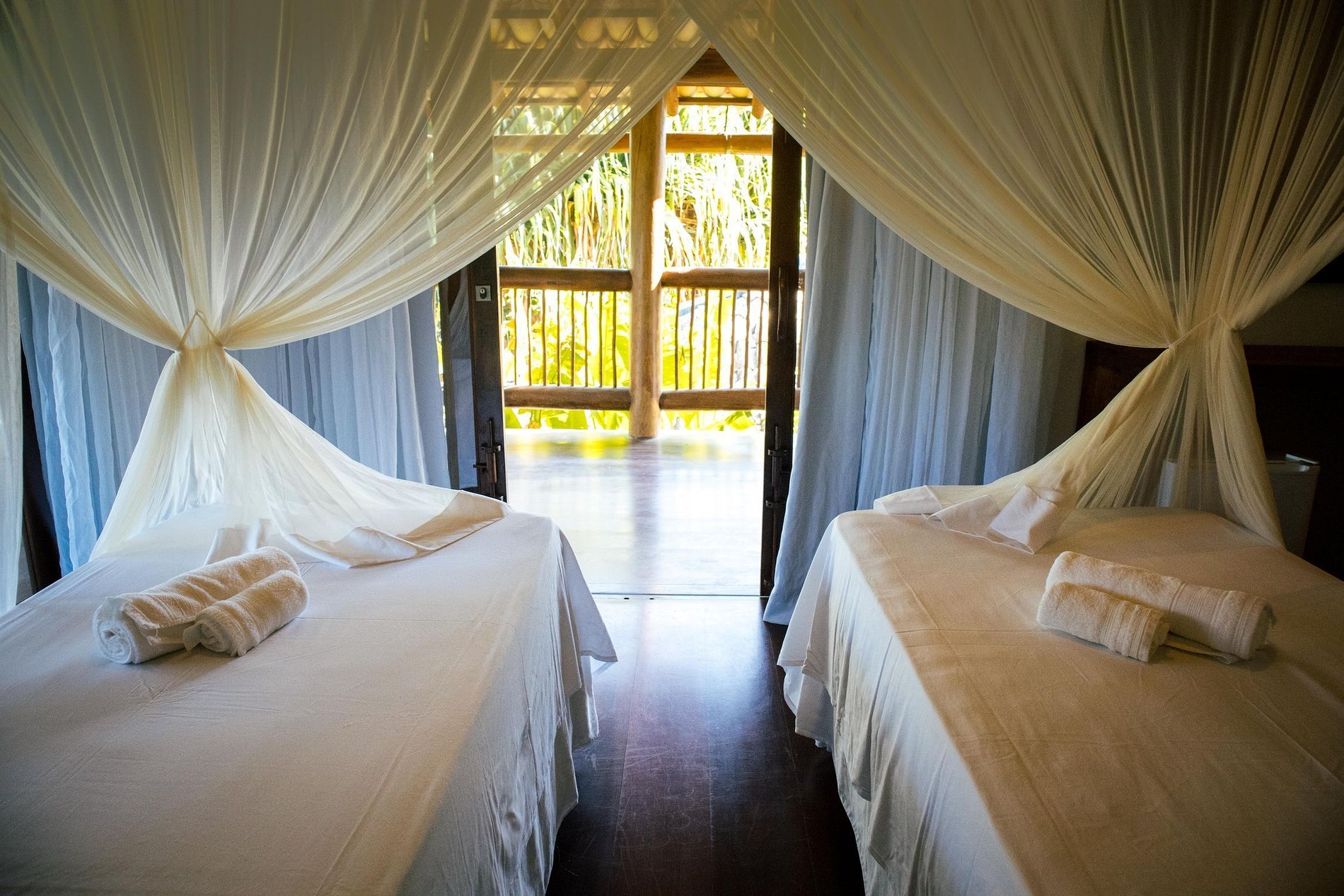 Suite 2: Two single beds (can be joined), musketeer, air conditioning, ceiling fan, TV, minibar, balcony with hammock, sea view and mangrove. (and extra bed)
