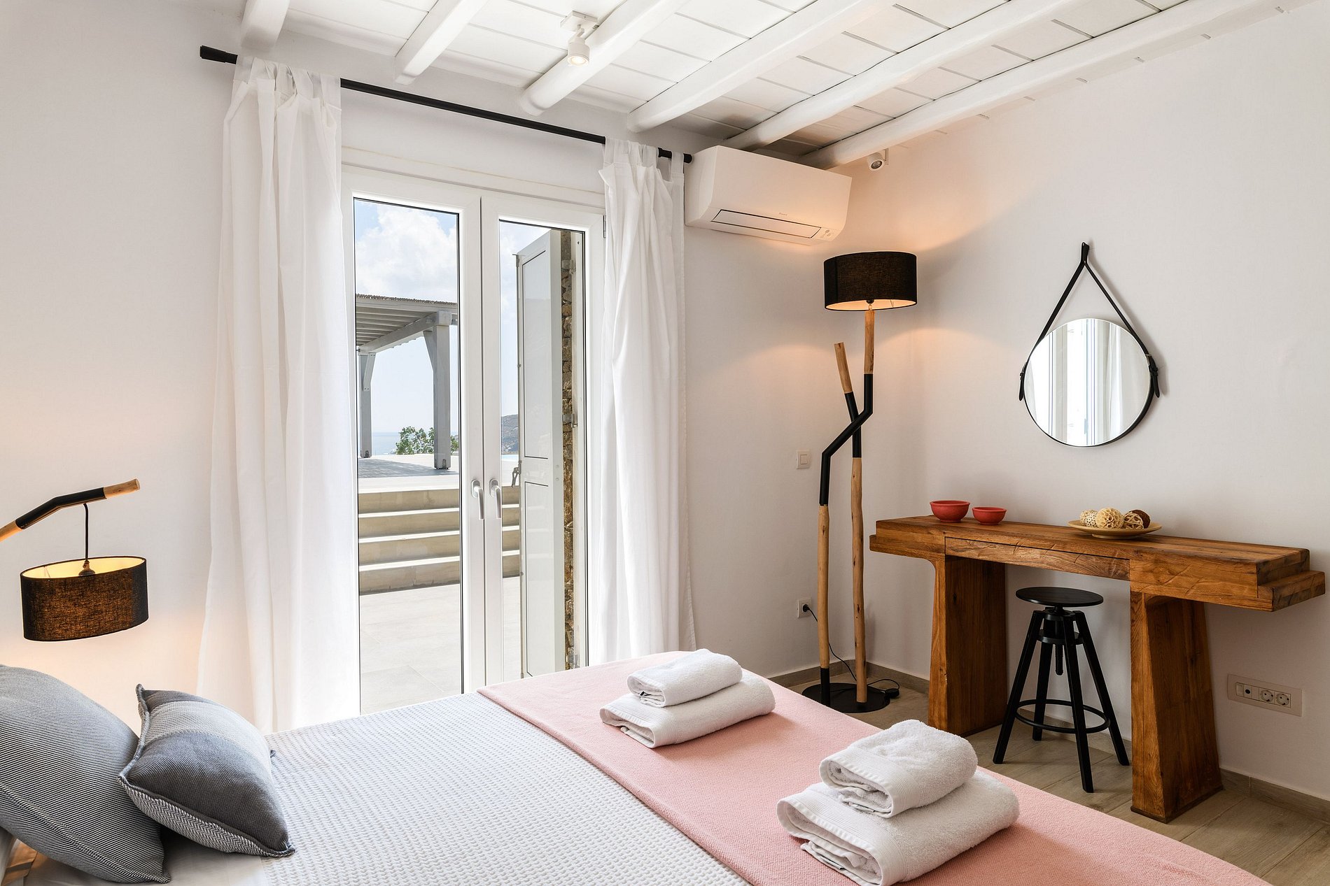 The meticulously curated design items and wood elements throughout the villa create a warm and inviting atmosphere, while the upper floors offer jaw-dropping sea views of Kalafatis Beach and the picturesque island of Divounia.