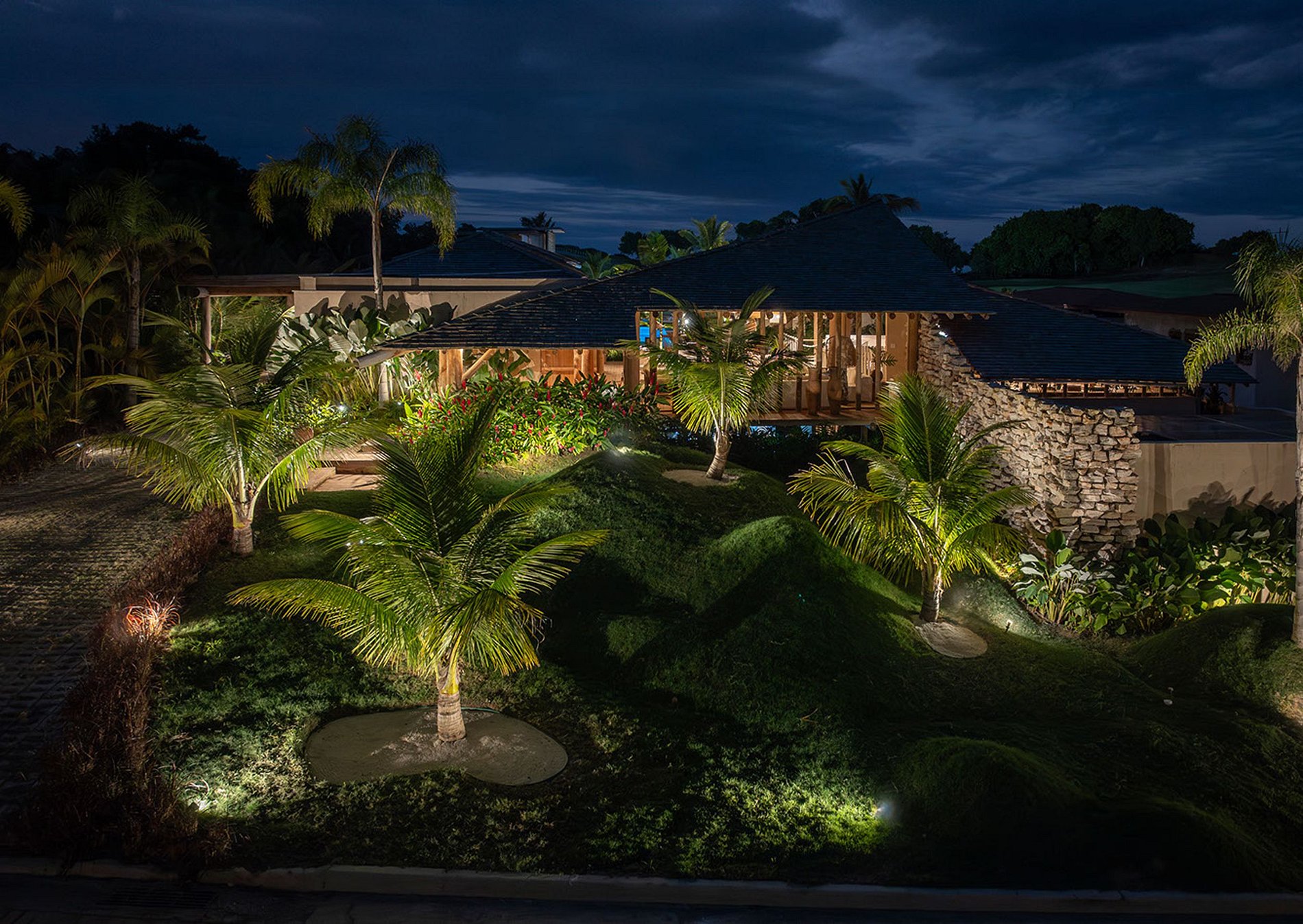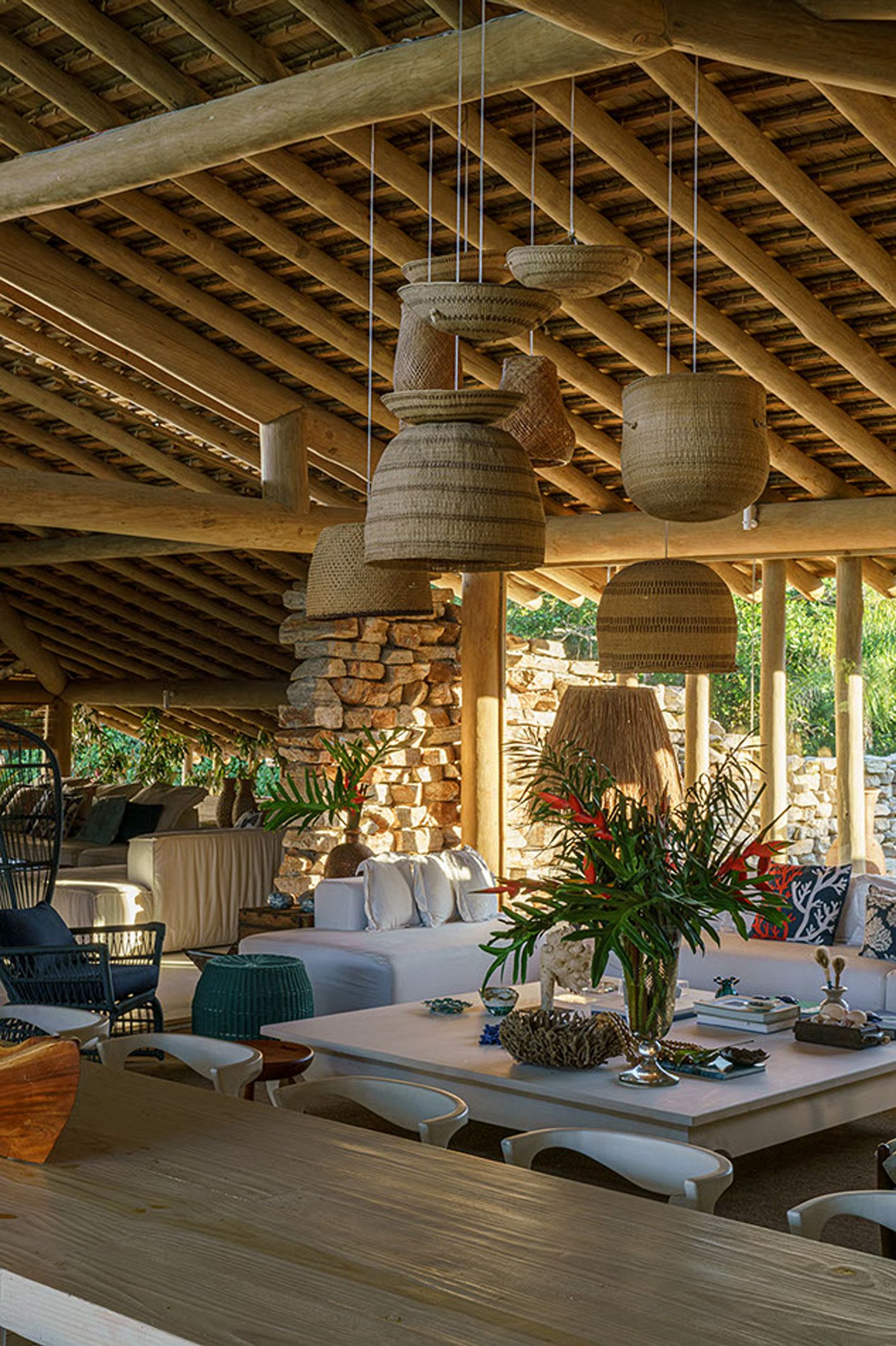 The front façade, well integrated into the lush landscaping, makes the house discreet. However, it has an excellent internal environment. Built with natural elements of wood and stone, it also takes advantage of the natural ventilation of Bahia, through open spaces.