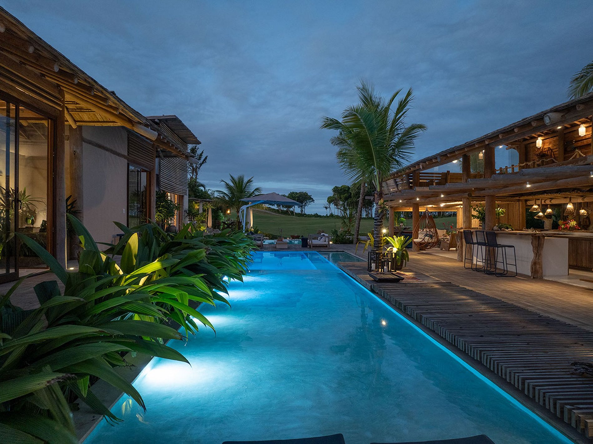 The house has 03 bungalows independent of the social area and overlooking the pool. Bungalows complete with minibar, air conditioning, sofa, balcony overlooking the pool. Some with sea views. And 4 more comfortable suites with suspended deck. The house accommodates 14 people and 4 children. That is, 5 king-size double beds. Plus 4 single beds and 4 trundle beds.