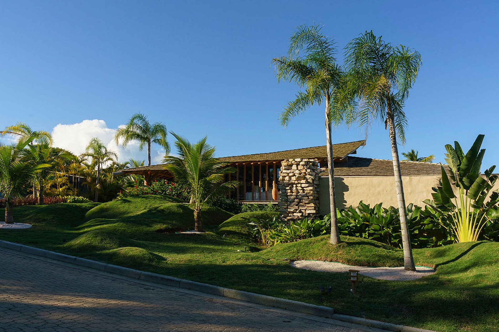 The front façade, well integrated into the lush landscaping, makes the house discreet. However, it has an excellent internal environment. Built with natural elements of wood and stone, it also takes advantage of the natural ventilation of Bahia, through open spaces.
