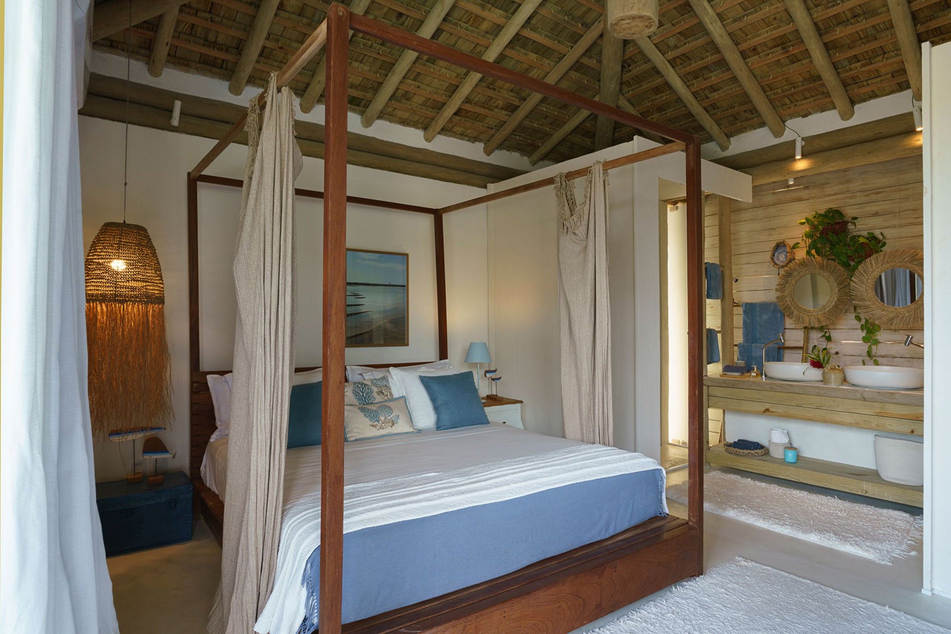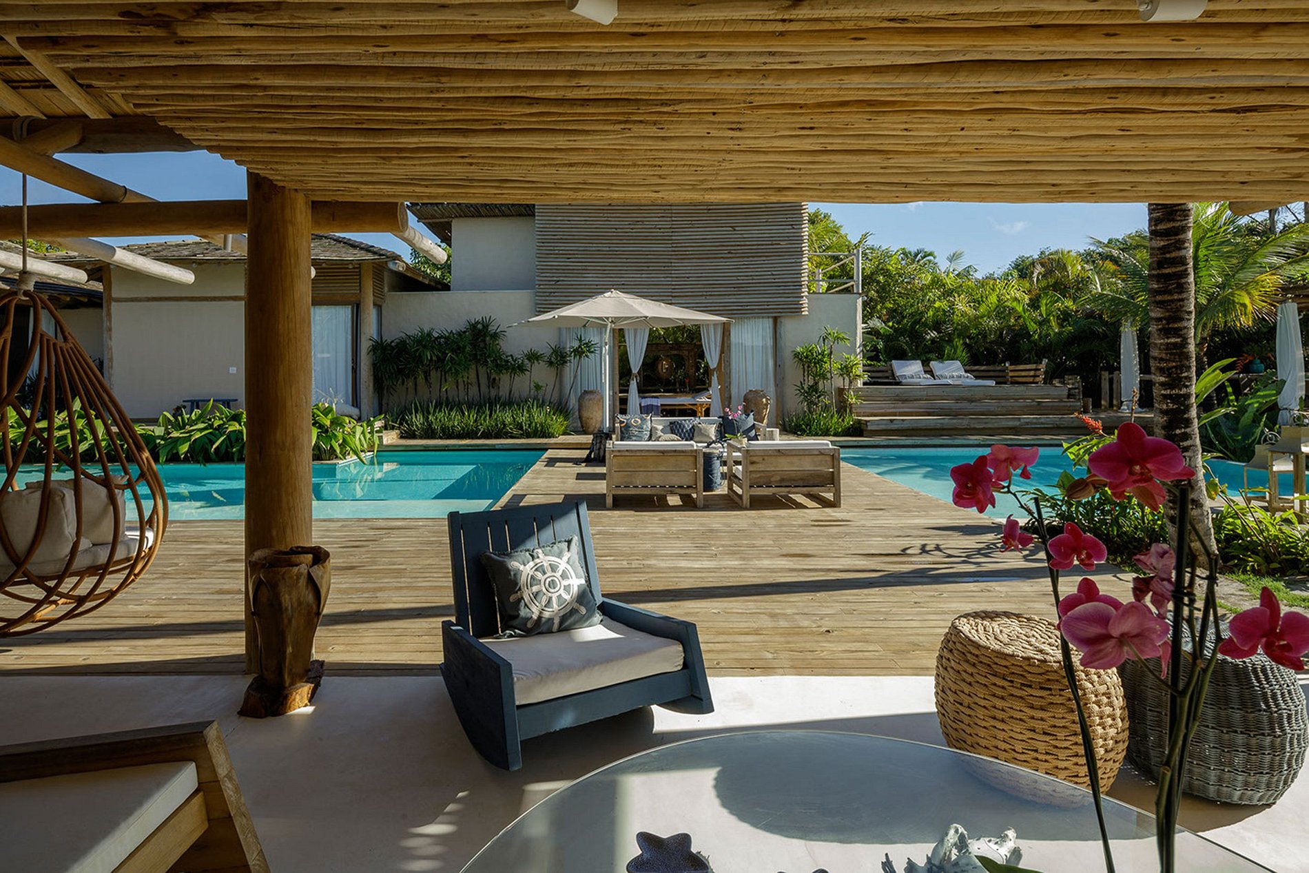 The house has 03 bungalows independent of the social area and overlooking the pool. Bungalows complete with minibar, air conditioning, sofa, balcony overlooking the pool. Some with sea views. And 4 more comfortable suites with suspended deck. The house accommodates 14 people and 4 children. That is, 5 king-size double beds. Plus 4 single beds and 4 trundle beds.
