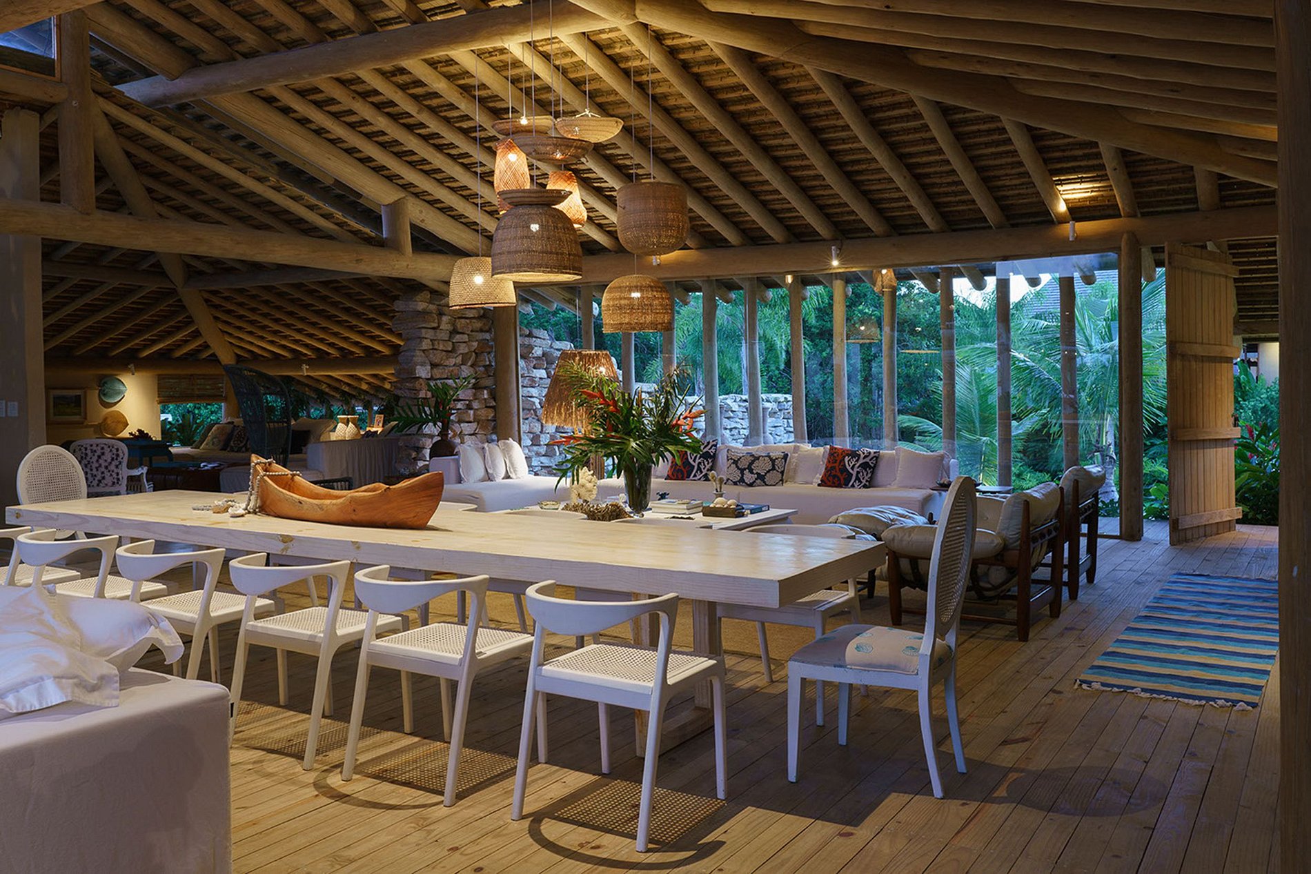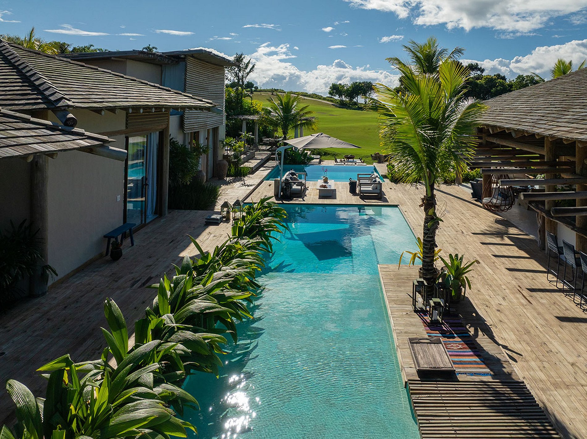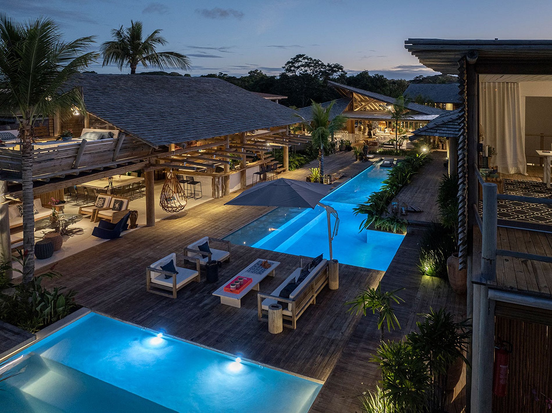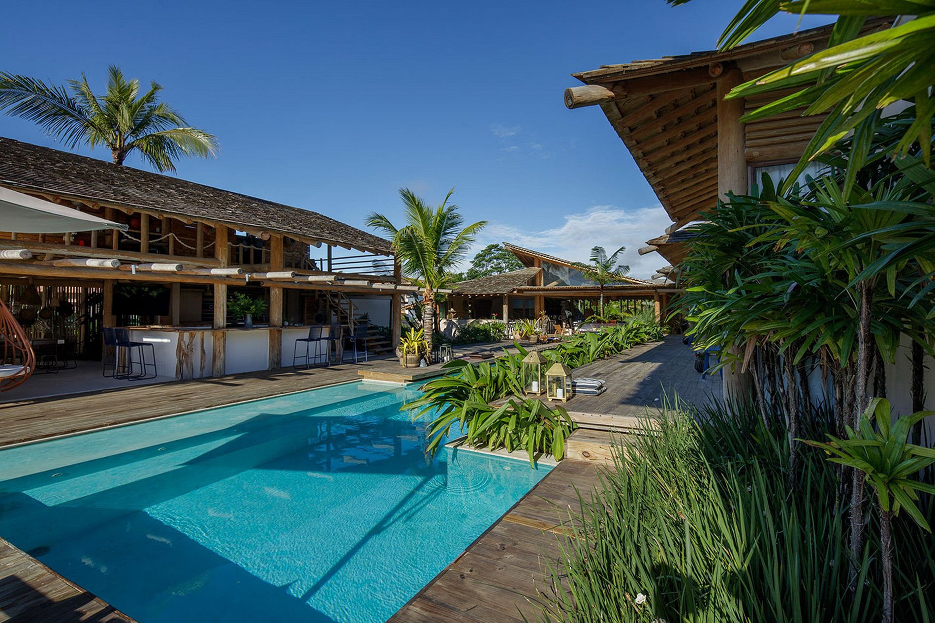 The house has 03 bungalows independent of the social area and overlooking the pool. Bungalows complete with minibar, air conditioning, sofa, balcony overlooking the pool. Some with sea views. And 4 more comfortable suites with suspended deck. The house accommodates 14 people and 4 children. That is, 5 king-size double beds. Plus 4 single beds and 4 trundle beds.