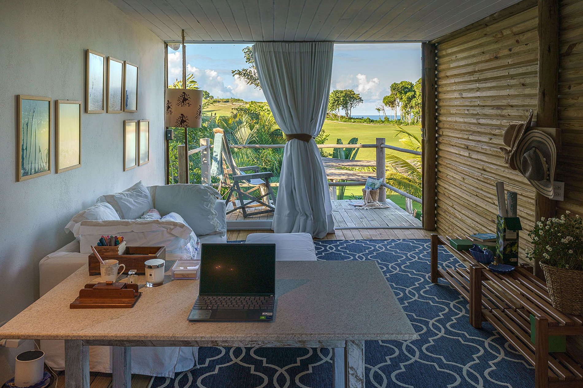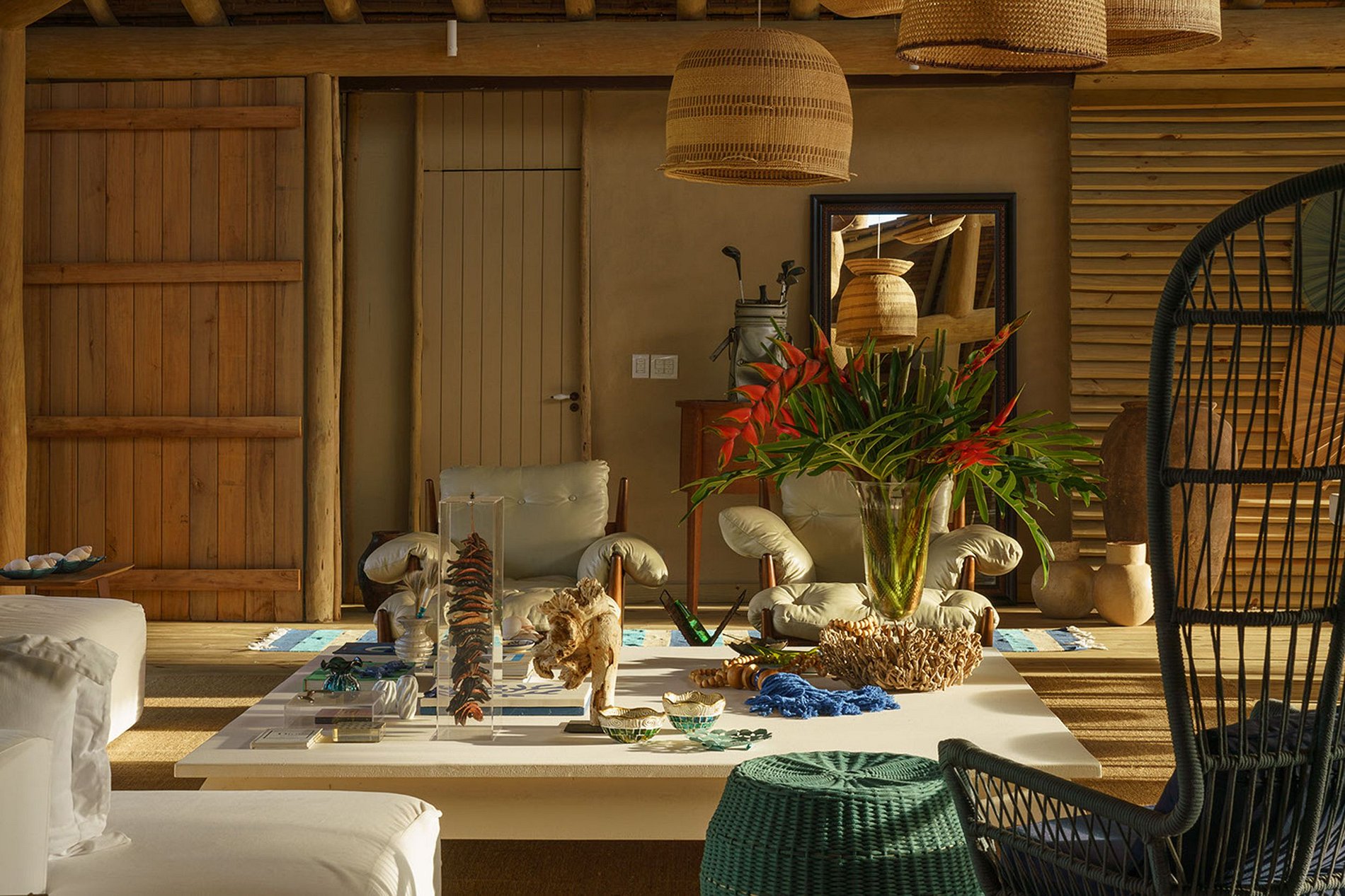 The front façade, well integrated into the lush landscaping, makes the house discreet. However, it has an excellent internal environment. Built with natural elements of wood and stone, it also takes advantage of the natural ventilation of Bahia, through open spaces.