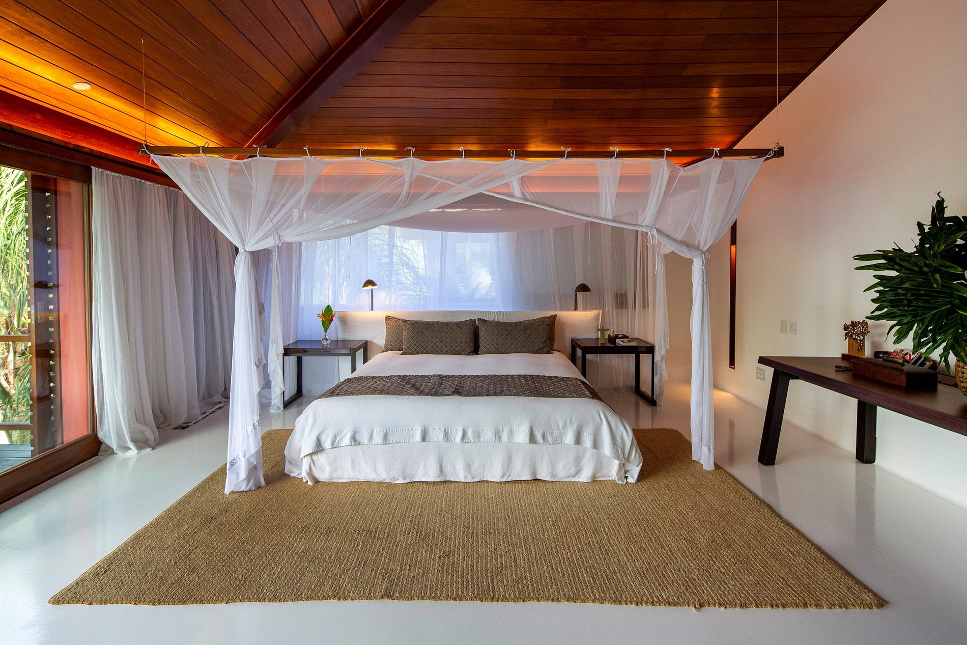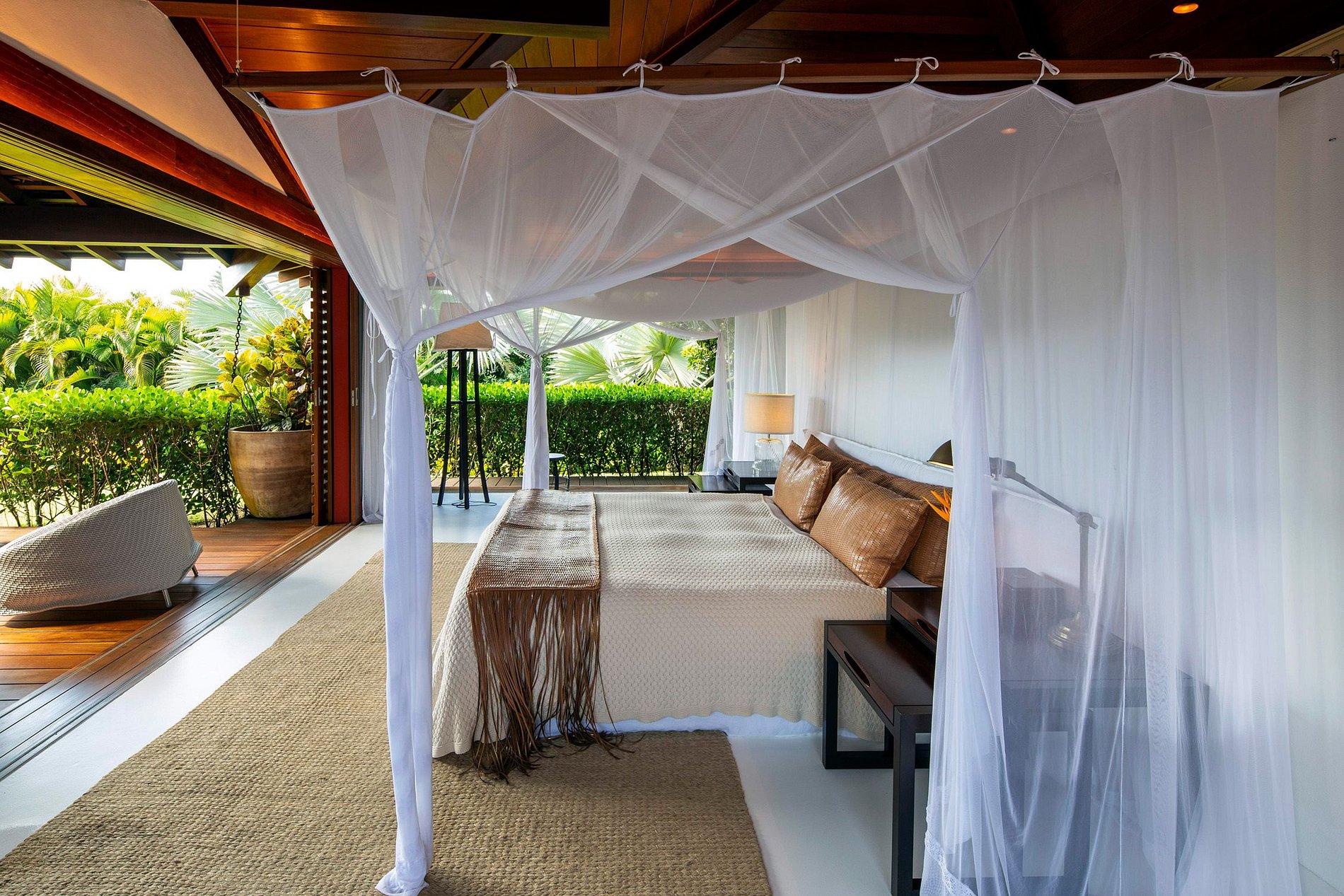 The intimate and social areas are interconnected by Cumaru walkways protected by impressive glass walls. The many recreational areas and covered terraces over the pool provide the perfect setting for great times with family and friends. The gigantic pool and fantastic open whirlpool area are set on a beautiful deck, which provides an added touch of comfort and a tropical ambiance.