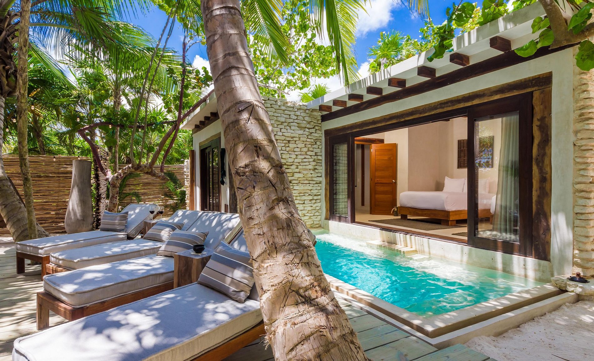 This house features a beautiful main house with private ocean front terrace and a roof top with a massive sun bed and spectacular views of the ocean and the jungle sunsets. Additionally, offers a pool house, an outdoor bar and a private central patio with sun beds next to a cozy private swimming pool.