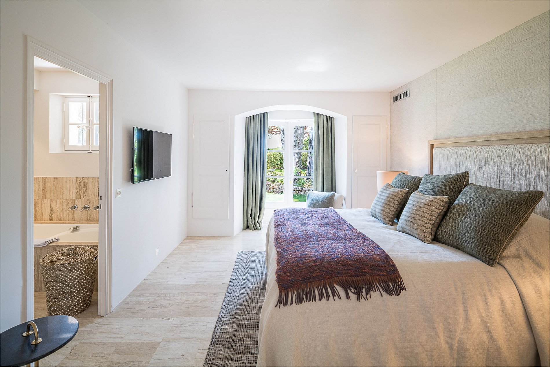Master Bedroom, King Size Double Bed 200 cm, large Dressing Room, Bathroom (Shower, Double Sink, Bathtub, WC), Smart TV, Apple TV & VOD, Satellite TV, Sonos sound system, safe, access to a large private terrace of 75 m2 (outdoor lounge), 180 ° west-facing view of the swimming pool and the landscaped park.
