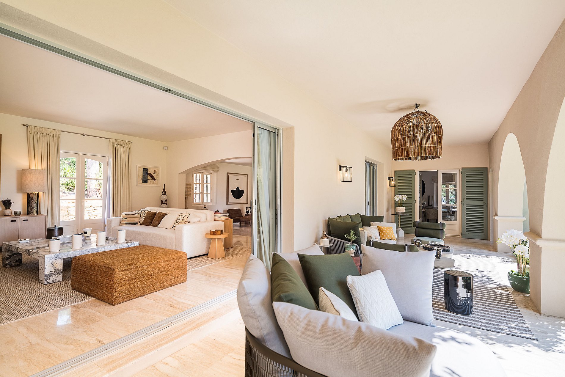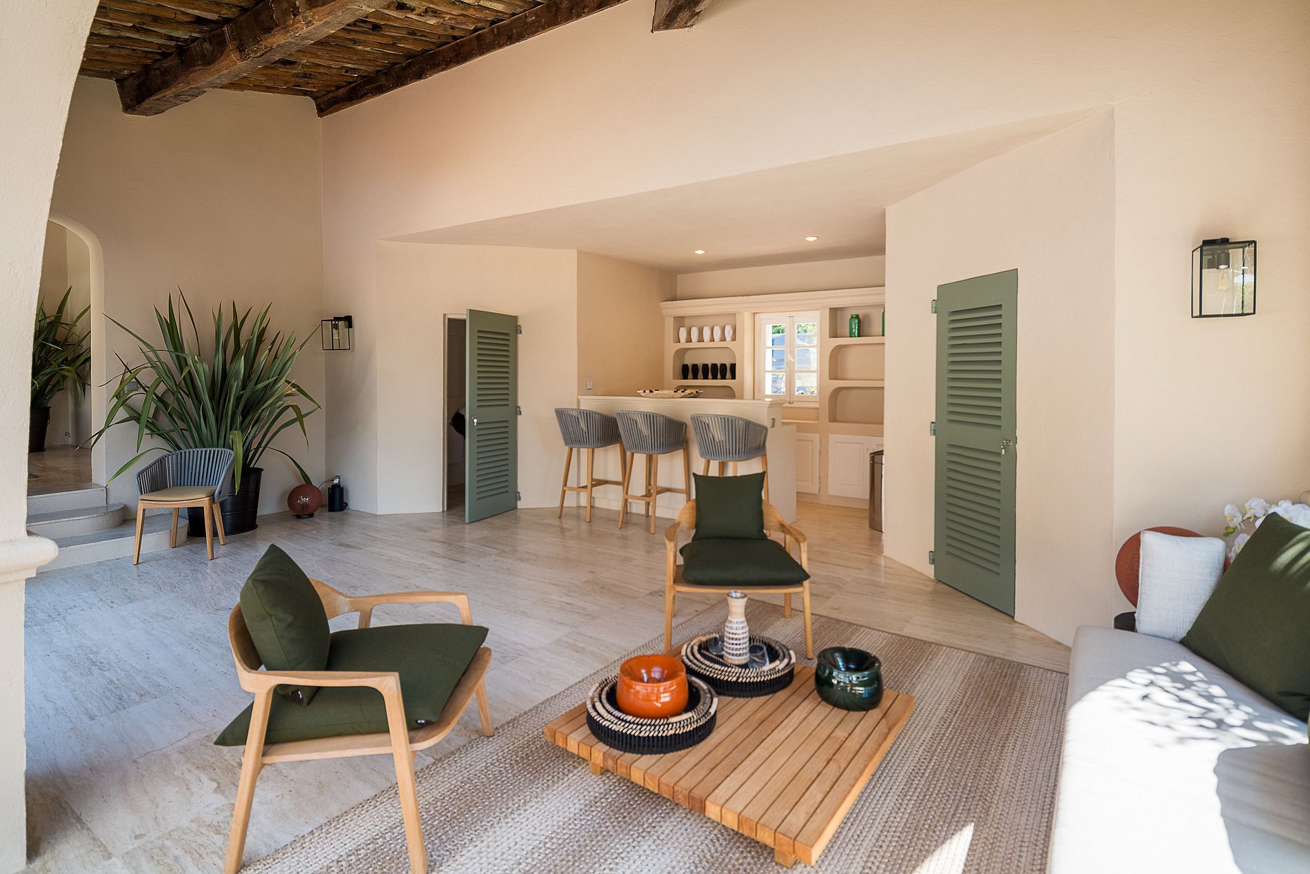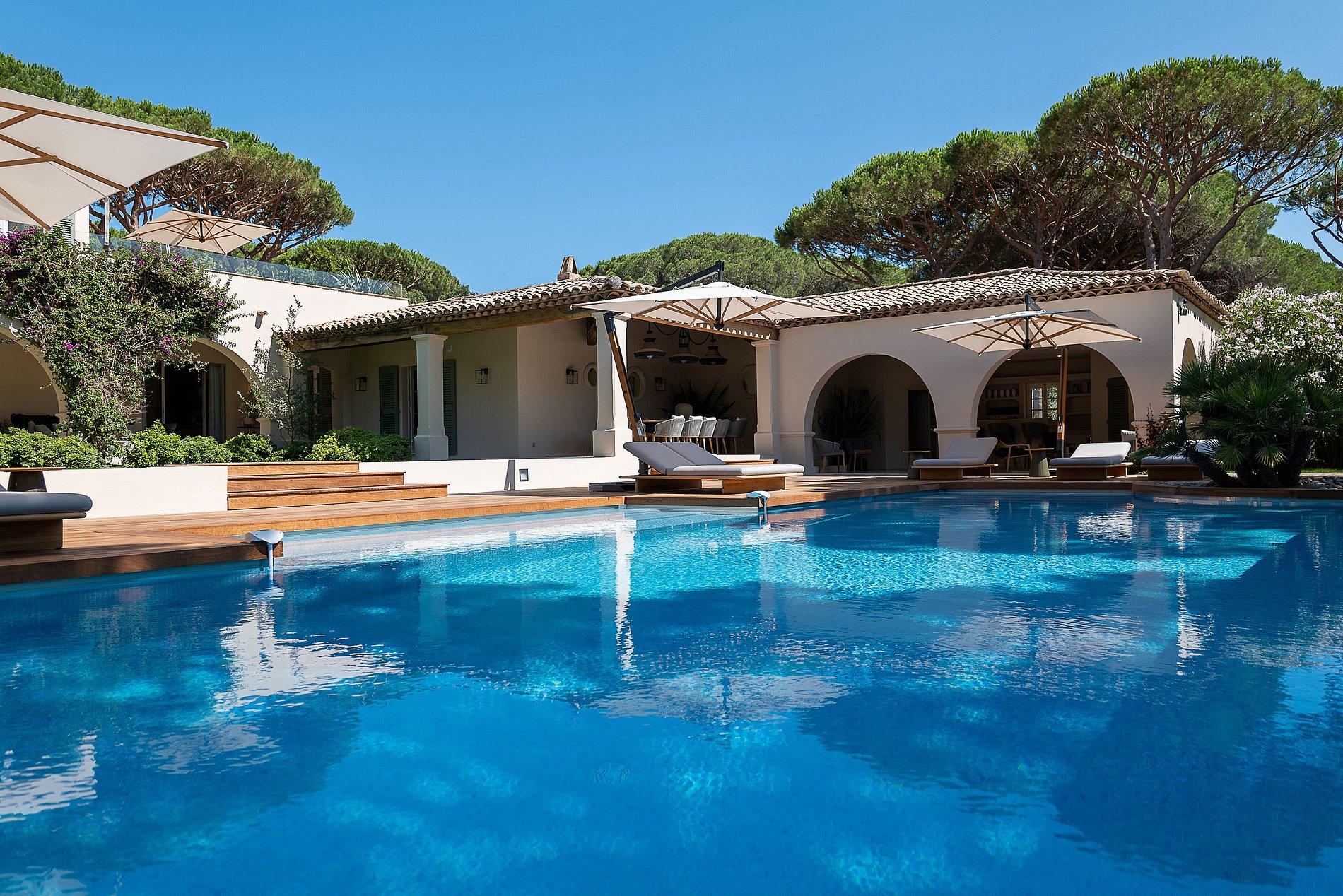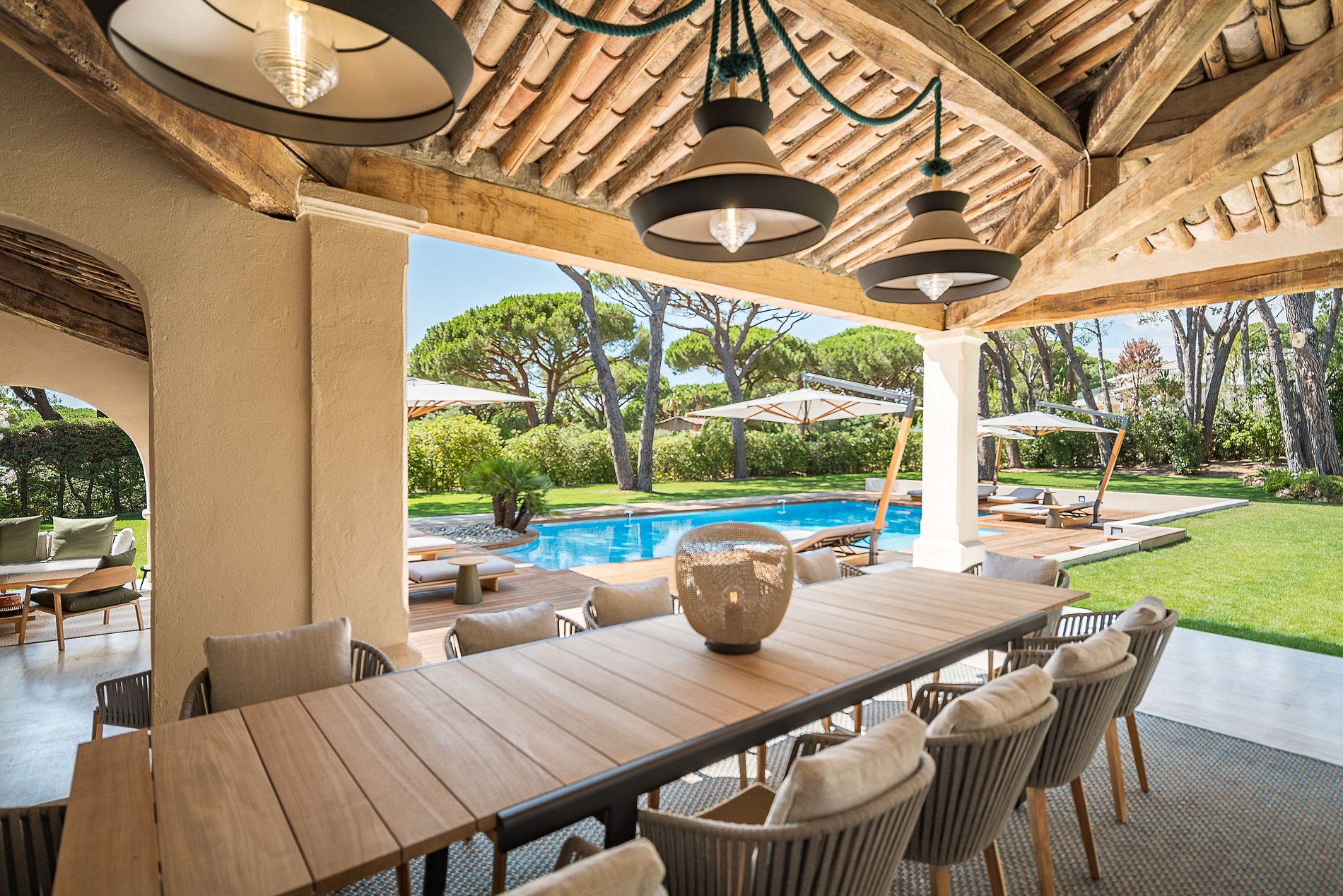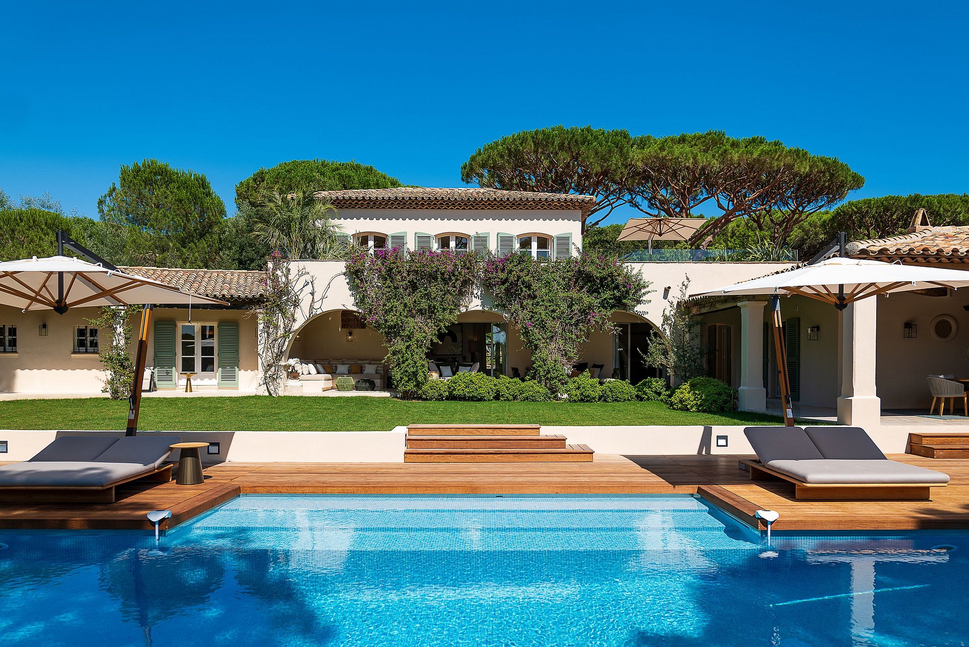 Superb provencal Villa of 500 m2 with 6 bedrooms, on 5,000 m2 of land located on the southern hill of the Parks of Saint-Tropez. A magnificent building with many indoor and outdoor living spaces (patios, private terraces, covered terraces, sunbathing, pool house, teak beach). Decoration of the house was selected by the French Decorator Stéphanie Coutas with a fusion style blending Bohemian Couture spirit with elegance and refinement in an interior open to nature.