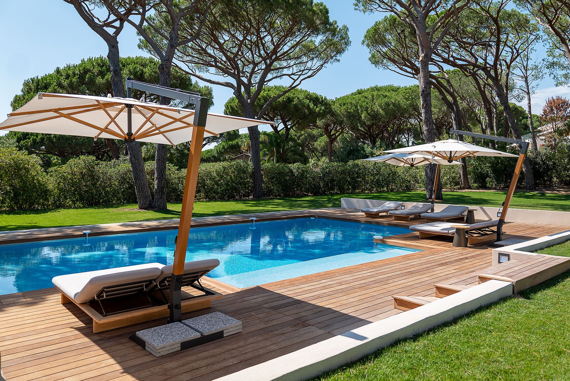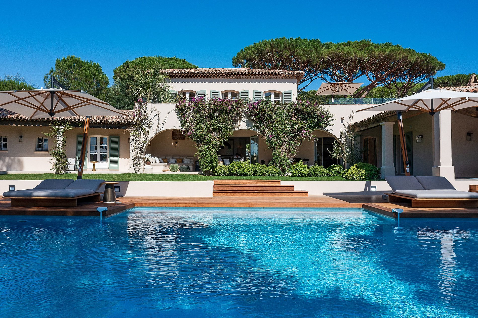 Superb provencal Villa of 500 m2 with 6 bedrooms, on 5,000 m2 of land located on the southern hill of the Parks of Saint-Tropez. A magnificent building with many indoor and outdoor living spaces (patios, private terraces, covered terraces, sunbathing, pool house, teak beach). Decoration of the house was selected by the French Decorator Stéphanie Coutas with a fusion style blending Bohemian Couture spirit with elegance and refinement in an interior open to nature.