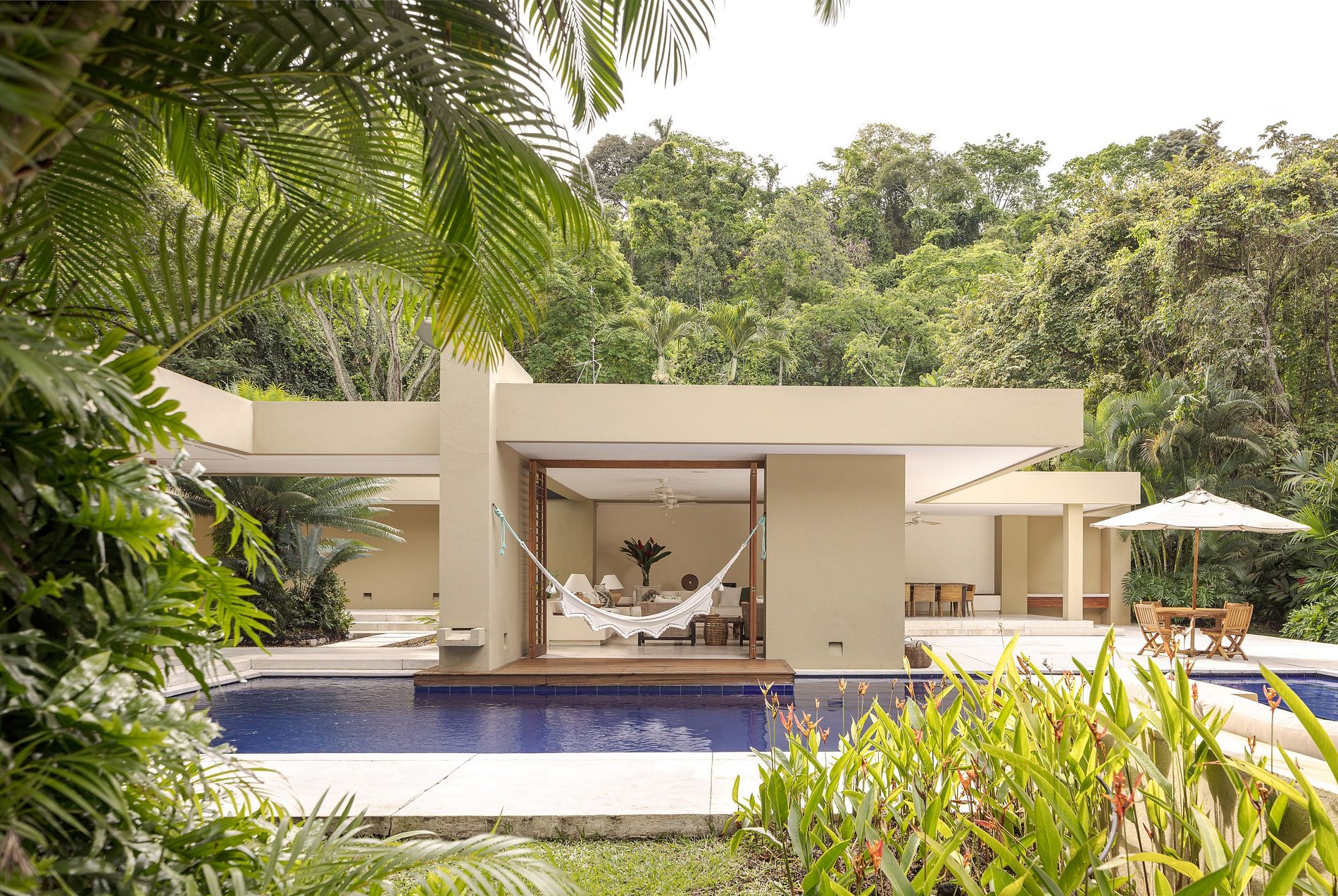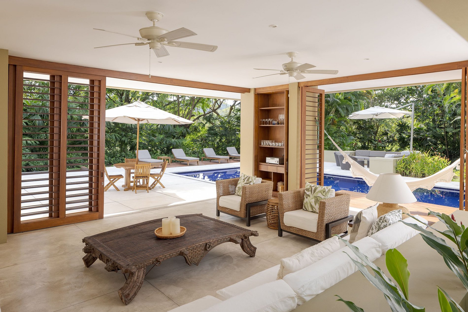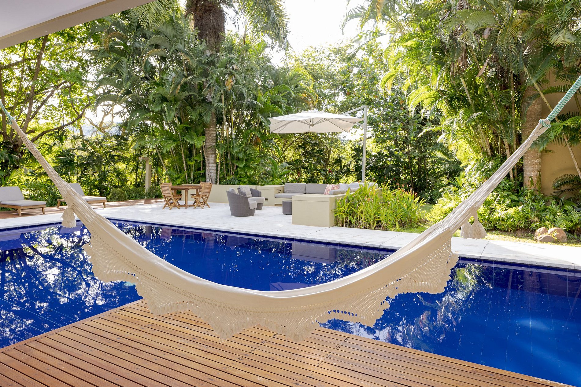 Outside, guests can enjoy a pool surrounded by lounge areas, hammocks, sun loungers, an outdoor dining table, and a shaded sofa area—everything designed for relaxation. The house also features a basketball court for recreational activities. A comfortable and serene retreat within one of Colombia’s most exclusive residential communities.