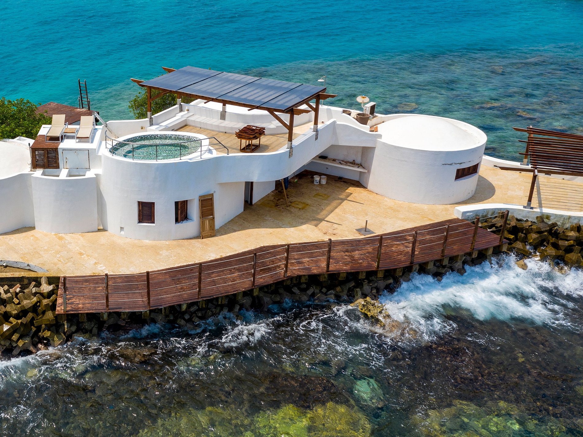 Paradise comes true. This prodigious island is located on Pelican Island, in the middle of the Caribbean Sea. Its cylindrical construction is quite impressive. It is divided into three sections, one of them has on the surface, around an outdoor pool with a deck and a bbq with a 360º view to the entire Caribbean Sea and the coast. At one end you have a kiosk where you can enjoy frozen drinks to cool off and assimilate the temperature of this place.