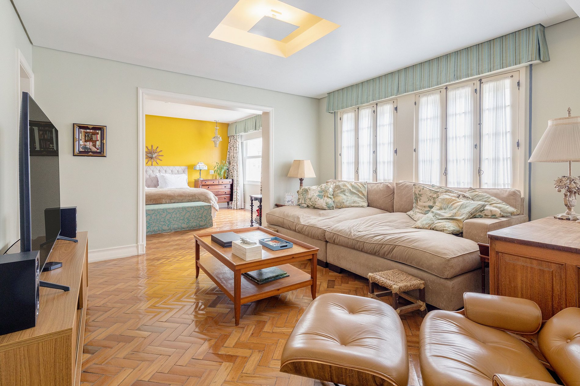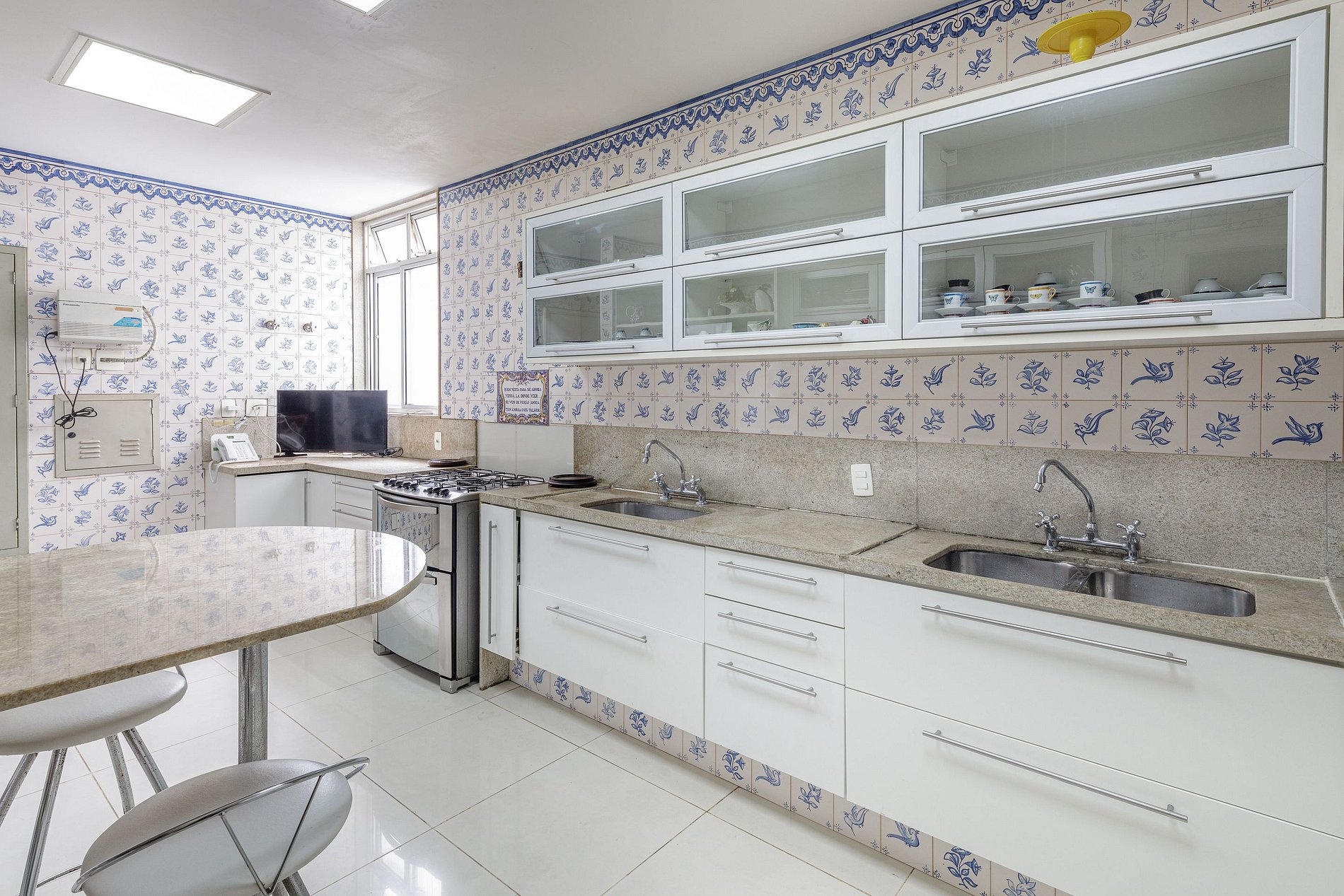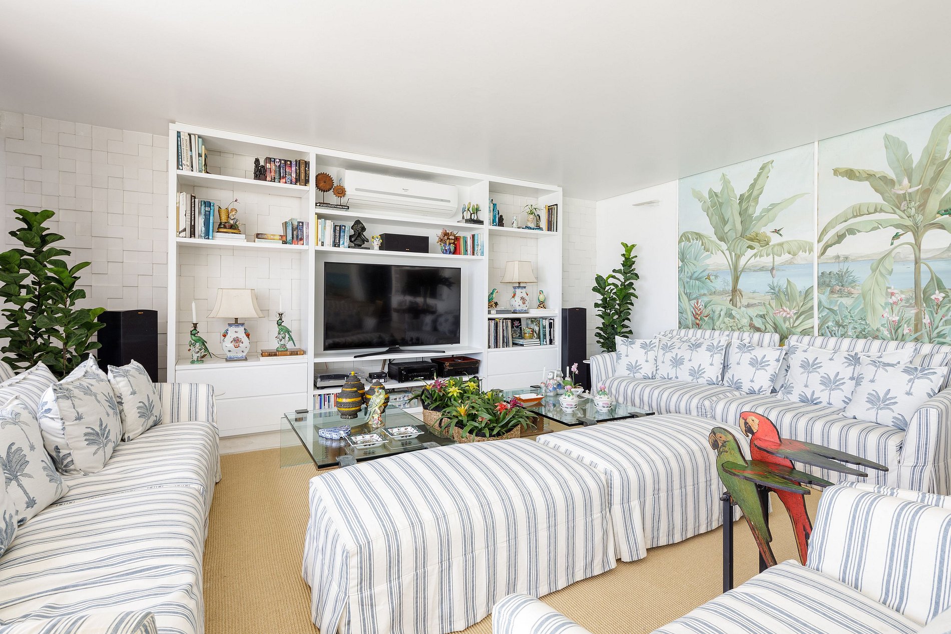 The apartment has five suites, three suites with dressing room and a double bed, and one suite with two single beds. Three suites are located on the first floor and have a TV room between them. The master suite is on the upper floor, and has an area of 120 m², a TV room and an office. The bathroom of the main suite has bath and two showers. All bathrooms are in white marble. All bedrooms and living rooms have air conditioning.The apartment has dining room and living room in both floors. The living room of the second floor has a 50-inch TV. Next to this room on the top floor is located a large terrace with panoramic sea views, where you can see the famous sunset of Arpoador. The apartment has two fully equipped kitchens, one downstairs , and a gourmet rooftop. All televisions have SKY.