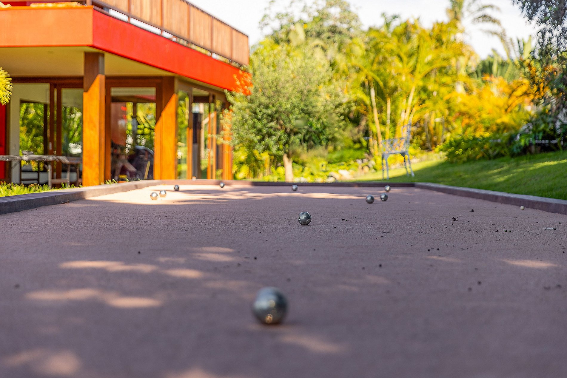 The villa features a gourmet kitchen, an exceptional wine cellar, and an open dining area accommodating up to 22 guests. Entertainment options are abundant, with a private cinema room, billiards, ping-pong table, and a petanque court.