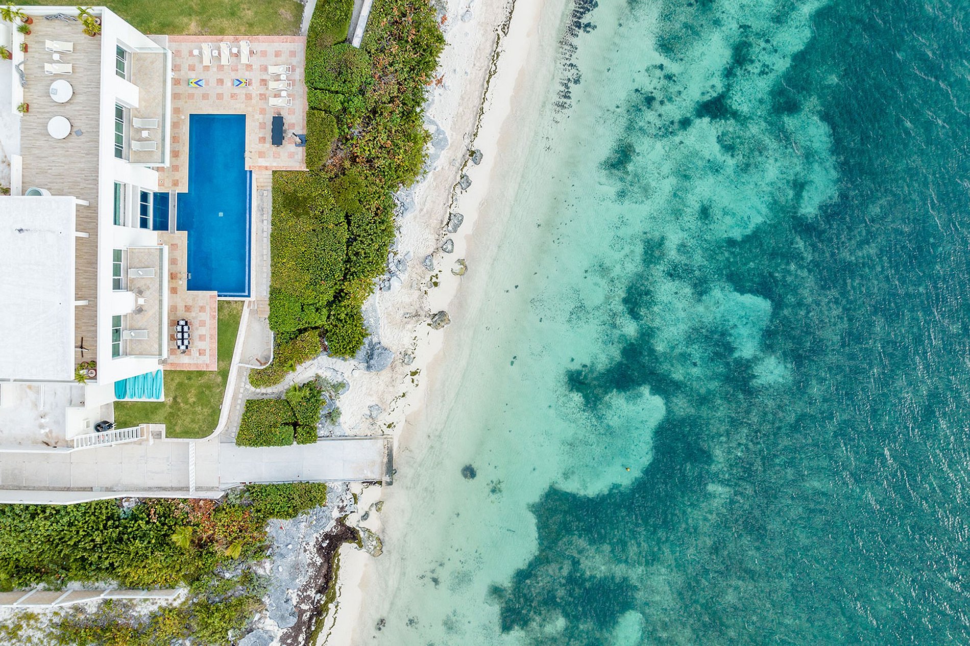 Indulge in the epitome of Caribbean living with the villa's generous indoor-outdoor living area, a fully equipped sports bar, and a sprawling garden adorned with a pool overlooking the ocean. Immerse yourself in the ambiance of stylish elegance as you unwind in one of the five impeccably furnished bedrooms on the second floor. Each bedroom presents breathtaking beach views, plush king and queen-sized beds, and private terraces.
