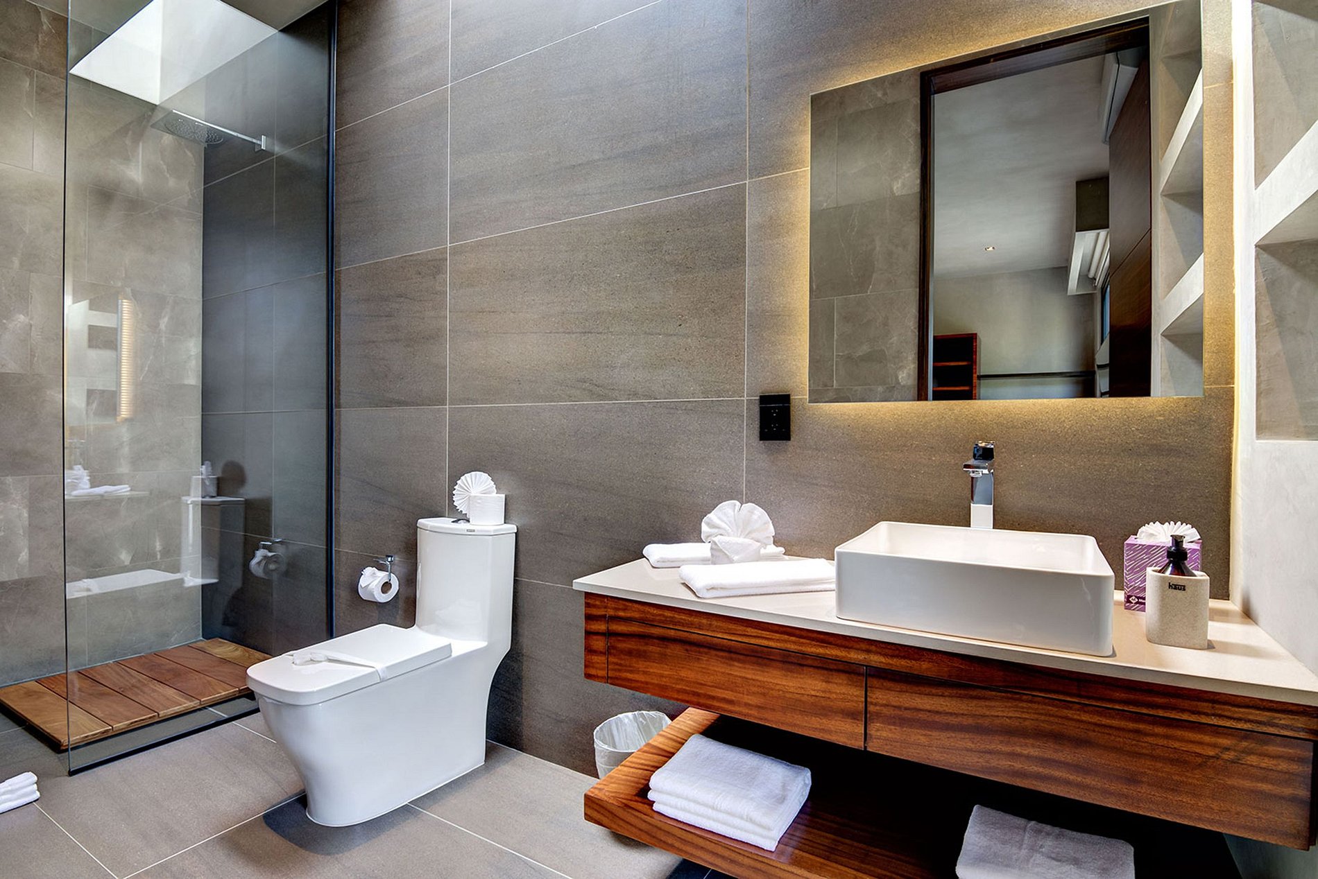 The bedrooms uphold the same exquisite aesthetic as the rest of the villa, providing ample space for relaxation. Two rooms on the second floor share a balcony that overlooks the garden, while the downstairs suite enjoys exclusive access to the pool and deck. All bedrooms boast spacious bathrooms equipped with high-end amenities.