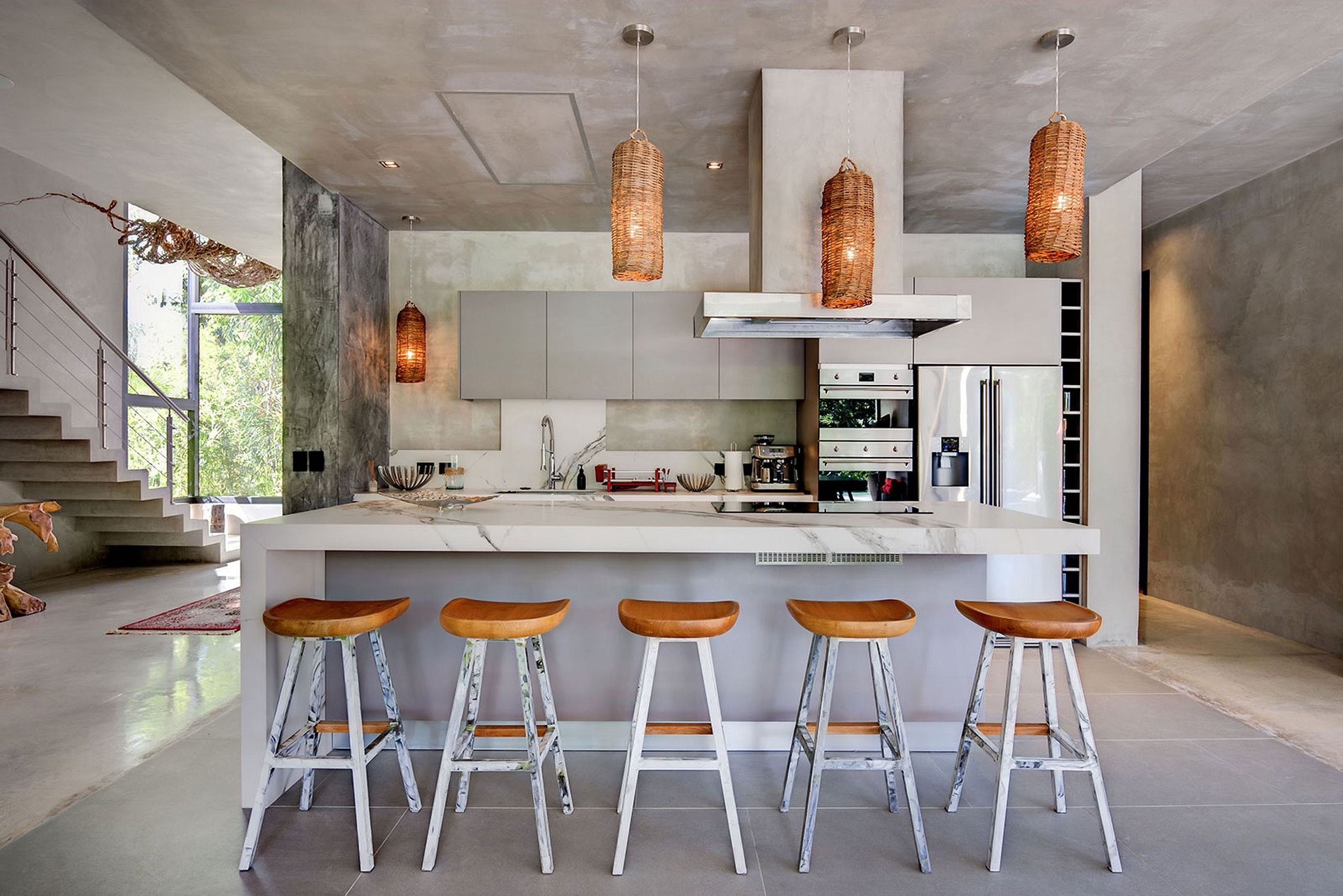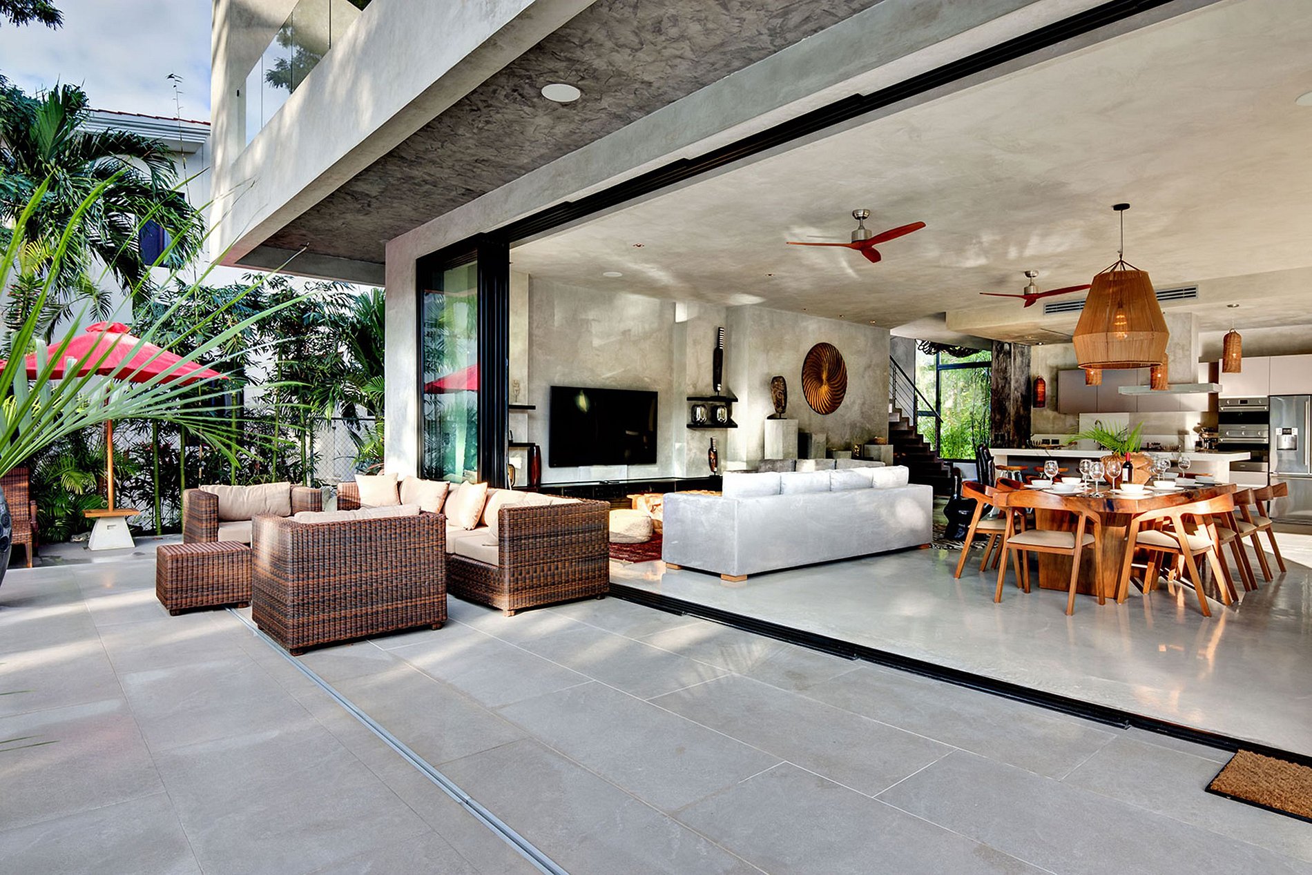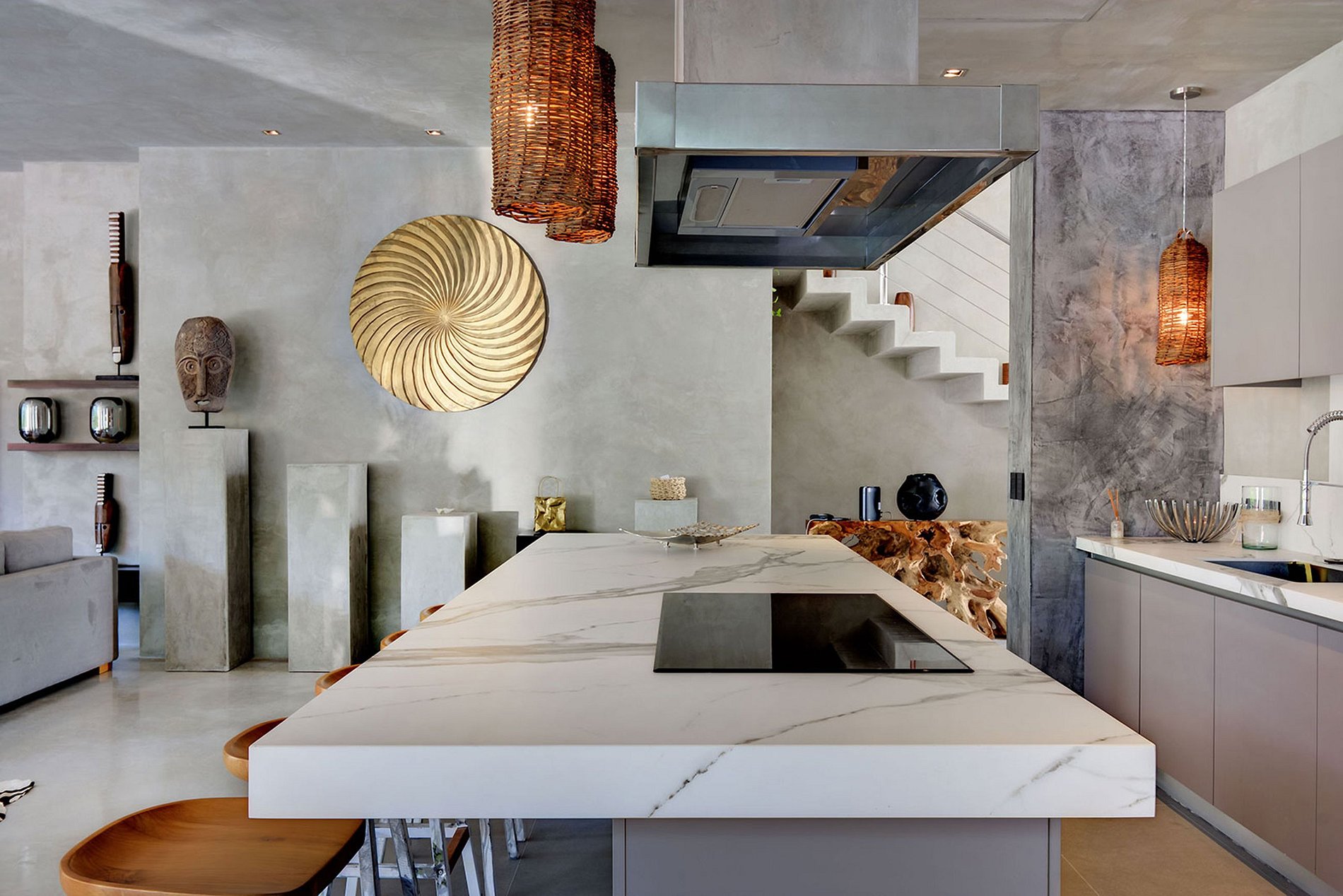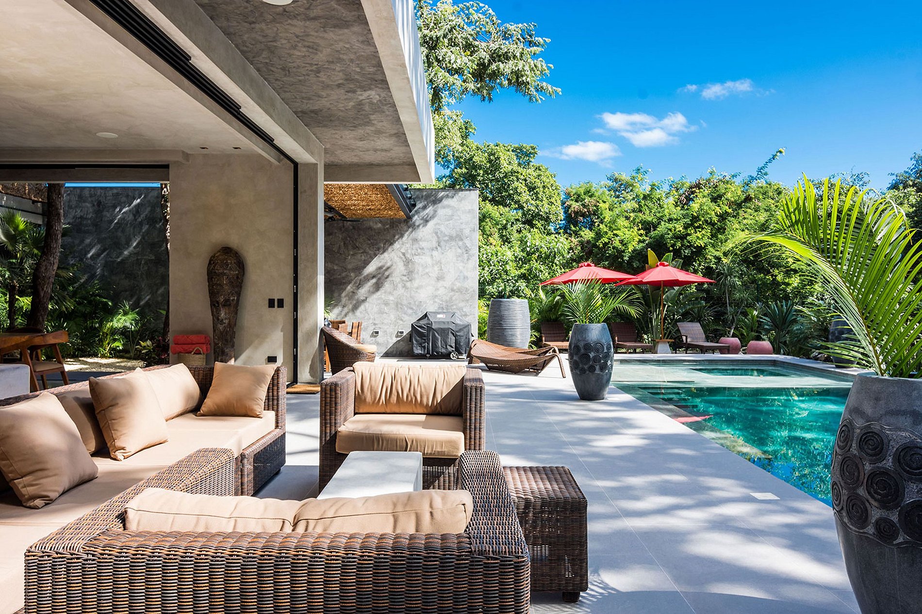 Crafted with sleek cement walls and complemented by contrasting rustic accents, the residence exudes a minimalist charm. Each room, from the expansive open-plan living area to the five suites, combines a tasteful simplicity with carefully curated designer furnishings, occasionally featuring artistic touches reminiscent of Dali. The generous indoor spaces foster togetherness, making this villa an ideal destination for unforgettable family vacations. Outdoors, the swimming pool and lounge area are embraced by lush native vegetation, creating a natural barrier between the house and the Playacar's 18-hole golf course.