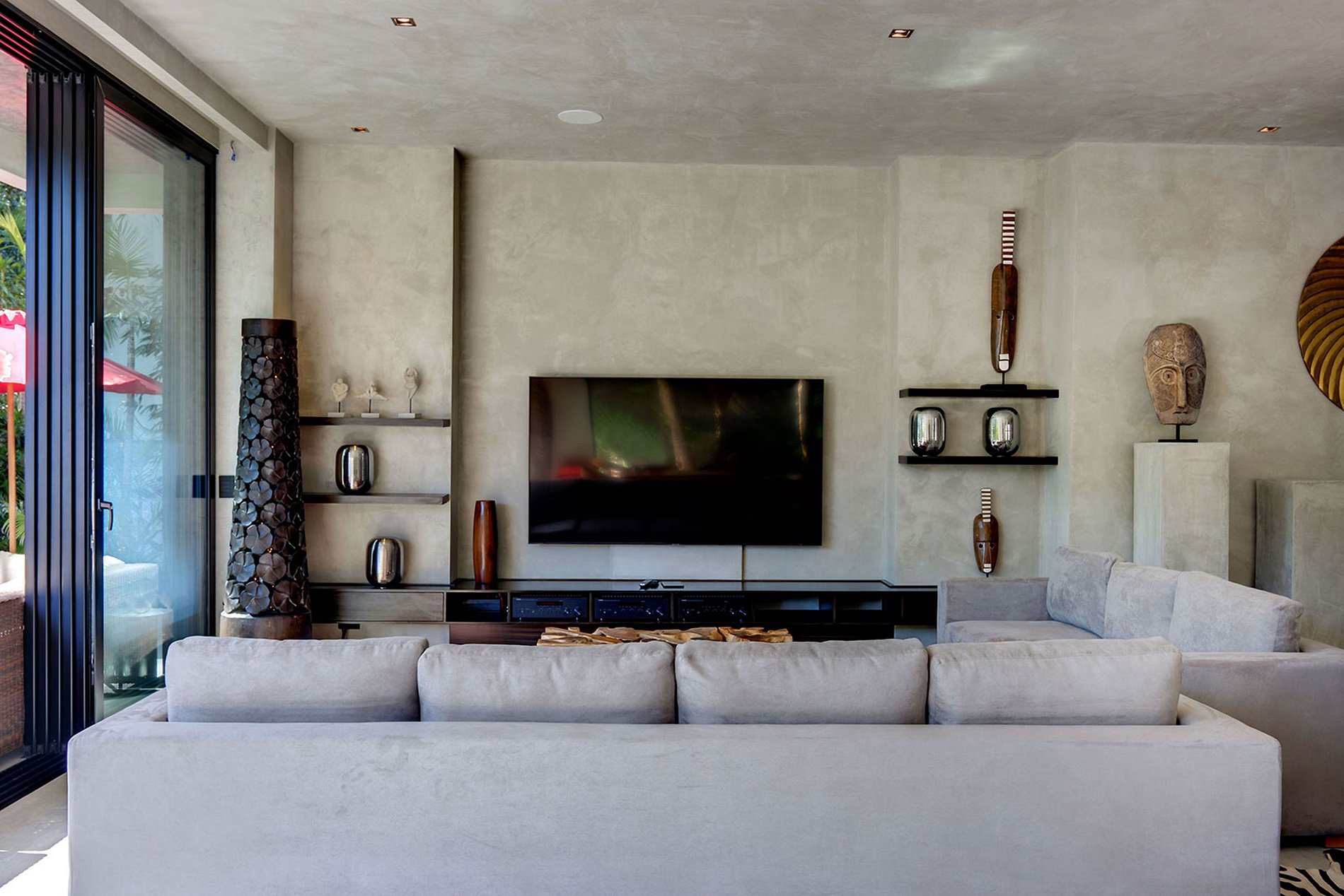 Crafted with sleek cement walls and complemented by contrasting rustic accents, the residence exudes a minimalist charm. Each room, from the expansive open-plan living area to the five suites, combines a tasteful simplicity with carefully curated designer furnishings, occasionally featuring artistic touches reminiscent of Dali. The generous indoor spaces foster togetherness, making this villa an ideal destination for unforgettable family vacations. Outdoors, the swimming pool and lounge area are embraced by lush native vegetation, creating a natural barrier between the house and the Playacar's 18-hole golf course.