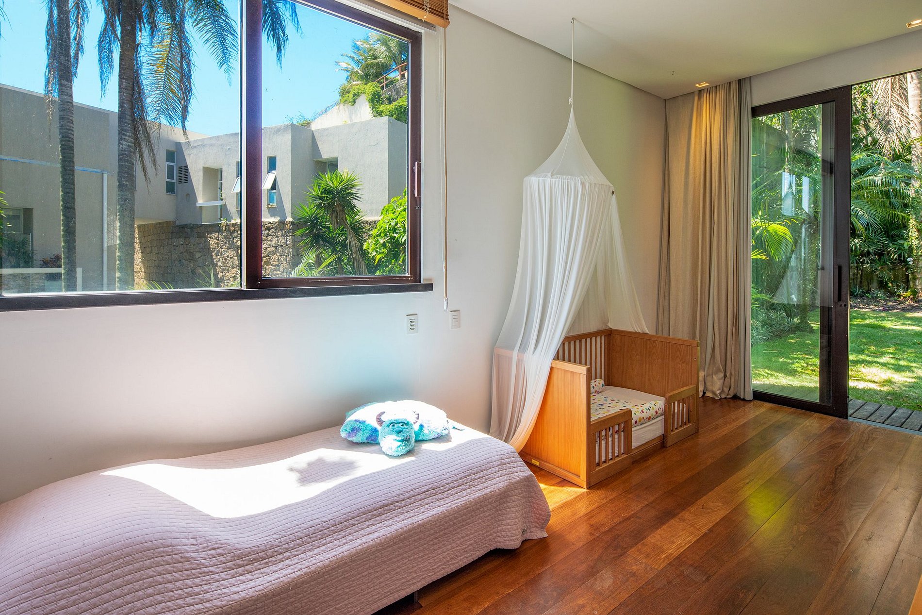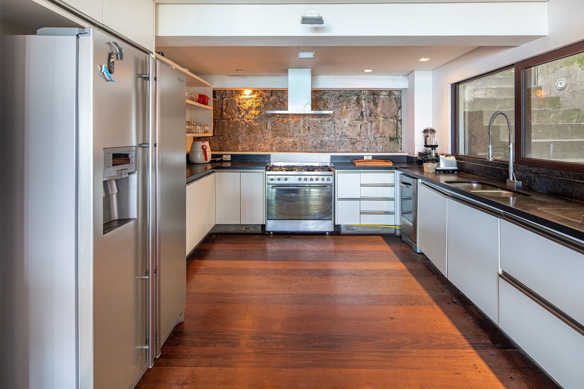 This house effortlessly marries contemporary design with classic tropical Brazilian elements, resulting in a truly captivating aesthetic. Throughout the space, you'll find exquisite hardwood floors, modern furnishings, and all the amenities one could desire. The combination of whitewashed walls and natural Brazilian stone not only imparts a stunning visual but also keeps the interior comfortably cool. These harmoniously blend with the surrounding natural beauty of the jungle, which is further brought indoors through the floor-to-ceiling windows.