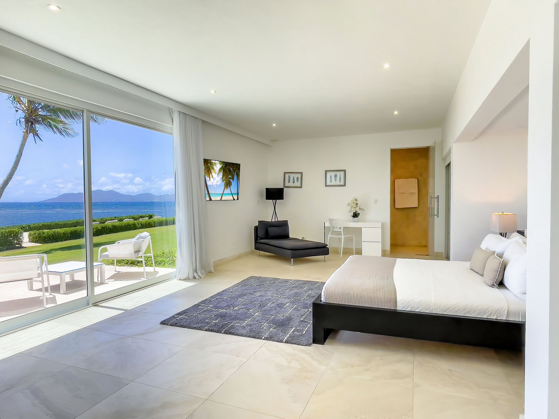 Set across a vast oceanfront estate, the villa combines high-end amenities with a warm, residential atmosphere. Guests are welcomed through a spectacular entrance hall into luminous, expansive interiors where high ceilings, floor-to-ceiling windows, and serene design accents create a relaxed yet sophisticated ambiance. The estate features a total of 11 bedrooms: nine located in the main house, and two additional suites in a separate guest house with its own living and dining area and private poolside deck — ideal for guests seeking more privacy.