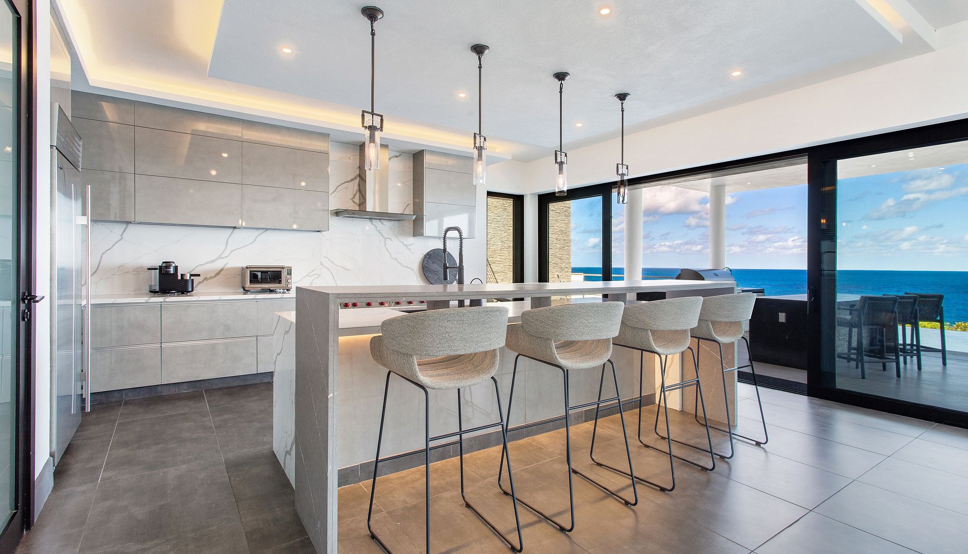 The living room is open and inviting, with oversized sofas and unobstructed views of the pool and ocean. Adjacent to it is a fully equipped, modern kitchen and an indoor dining area. The property also includes a BBQ area, outdoor kitchen, smart TVs, cable channels, wine fridge, and high-speed WiFi. Guests enjoy the comfort of daily housekeeping (except Sundays and holidays), a welcome cocktail upon arrival, and complimentary arrival transfer from the airport or port.