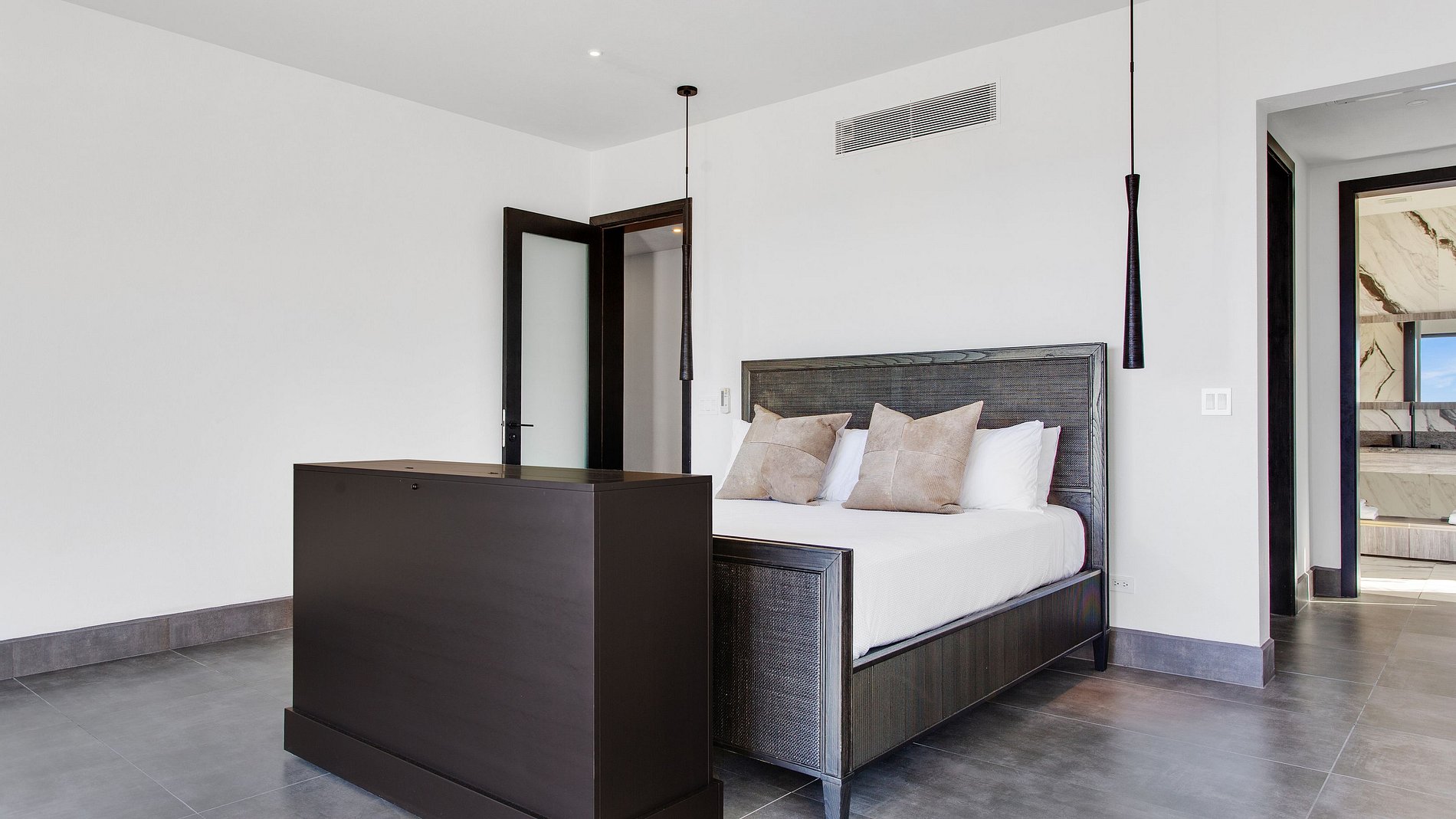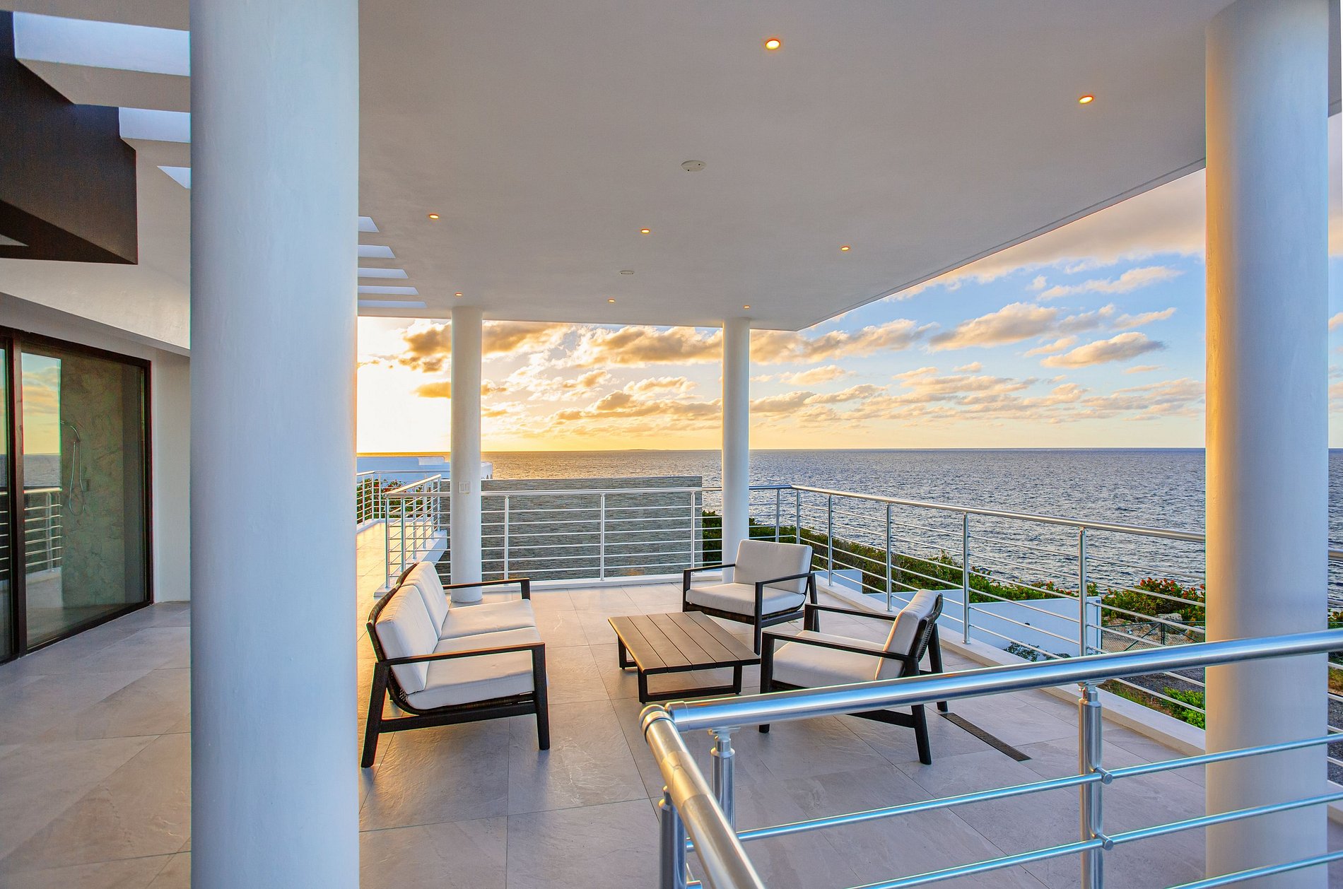 The villa’s bold architectural concept is defined by clean geometric lines, soft neutral tones, and floor-to-ceiling glass panels that blend seamlessly with the Caribbean surroundings. The outdoor spaces are centered around a sleek infinity pool that seems to melt into the turquoise horizon. Multiple furnished terraces, a heated pool (on request), and outdoor dining areas allow guests to unwind while enjoying breathtaking views of the sea and the untouched landscape of Black Garden.