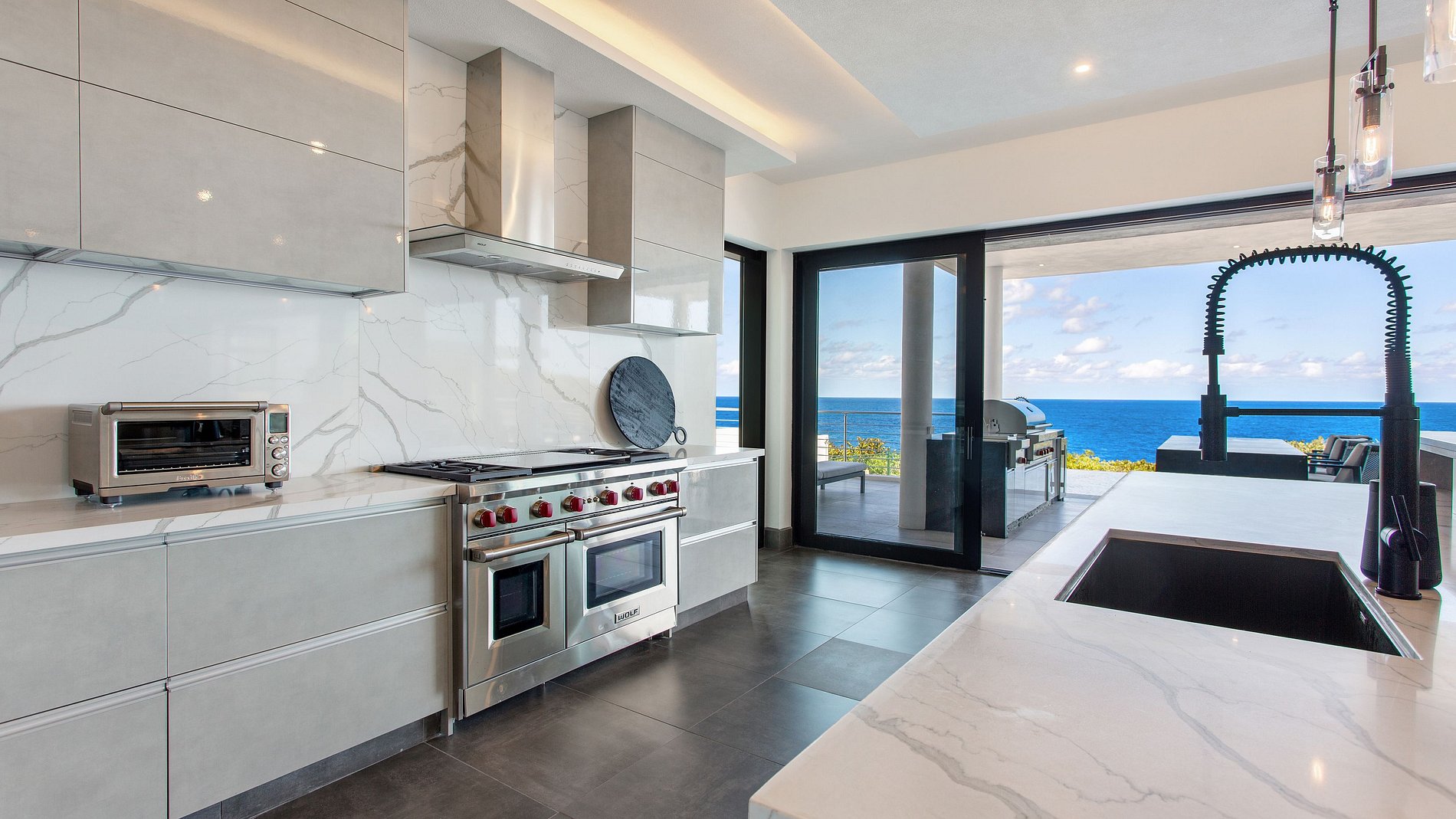 The living room is open and inviting, with oversized sofas and unobstructed views of the pool and ocean. Adjacent to it is a fully equipped, modern kitchen and an indoor dining area. The property also includes a BBQ area, outdoor kitchen, smart TVs, cable channels, wine fridge, and high-speed WiFi. Guests enjoy the comfort of daily housekeeping (except Sundays and holidays), a welcome cocktail upon arrival, and complimentary arrival transfer from the airport or port.