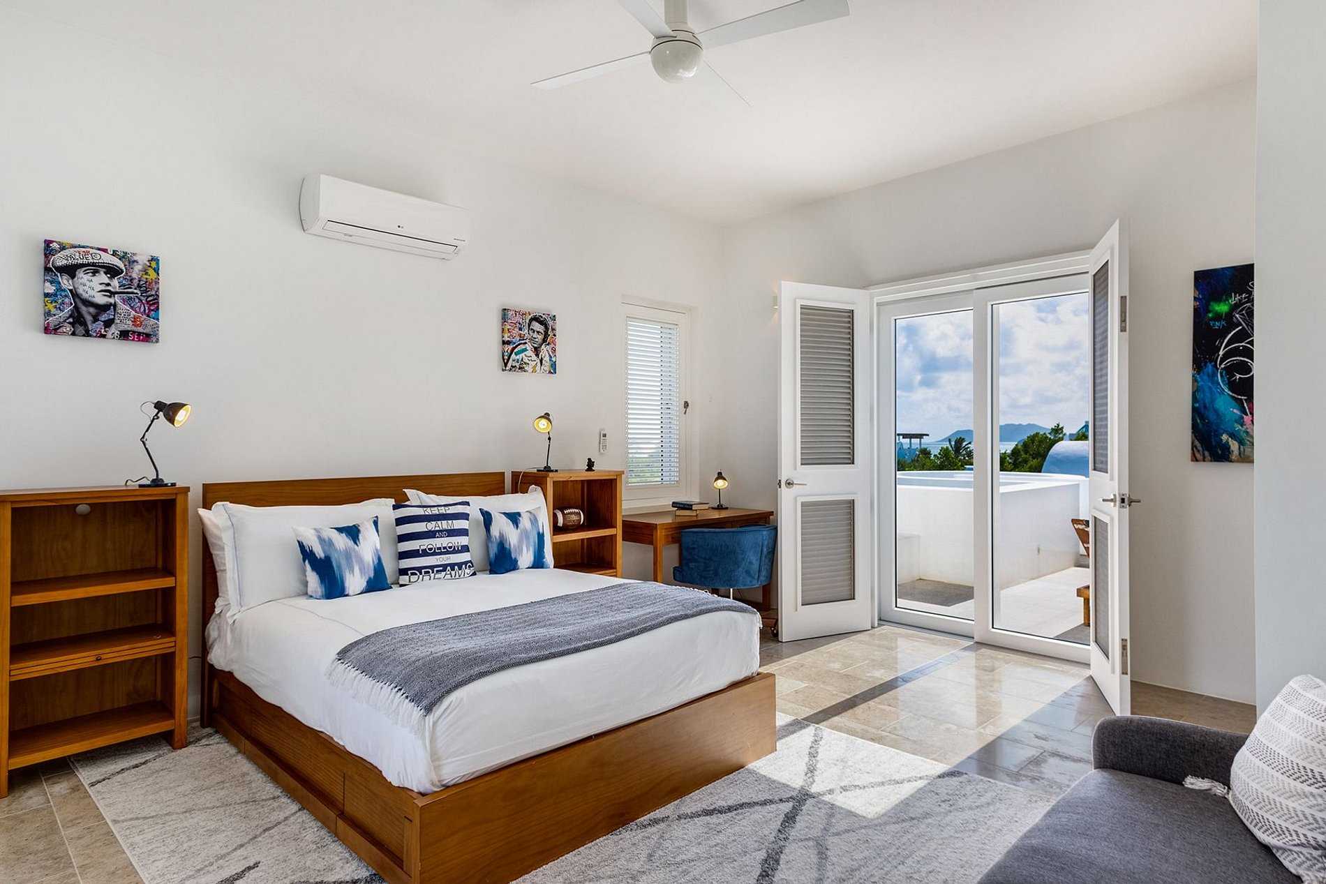 The villa features four large bedrooms, each with its own en-suite marble bathroom and private outdoor space. Two bedrooms are located on the main floor, both with king-size beds, walk-in closets, and direct access to either the garden or pool. Upstairs, the master suite and a queen bedroom each feature two private terraces—one with sea views, the other overlooking the golf course—as well as outdoor showers and elevated privacy. A dedicated office space with sea views connects both rooms.