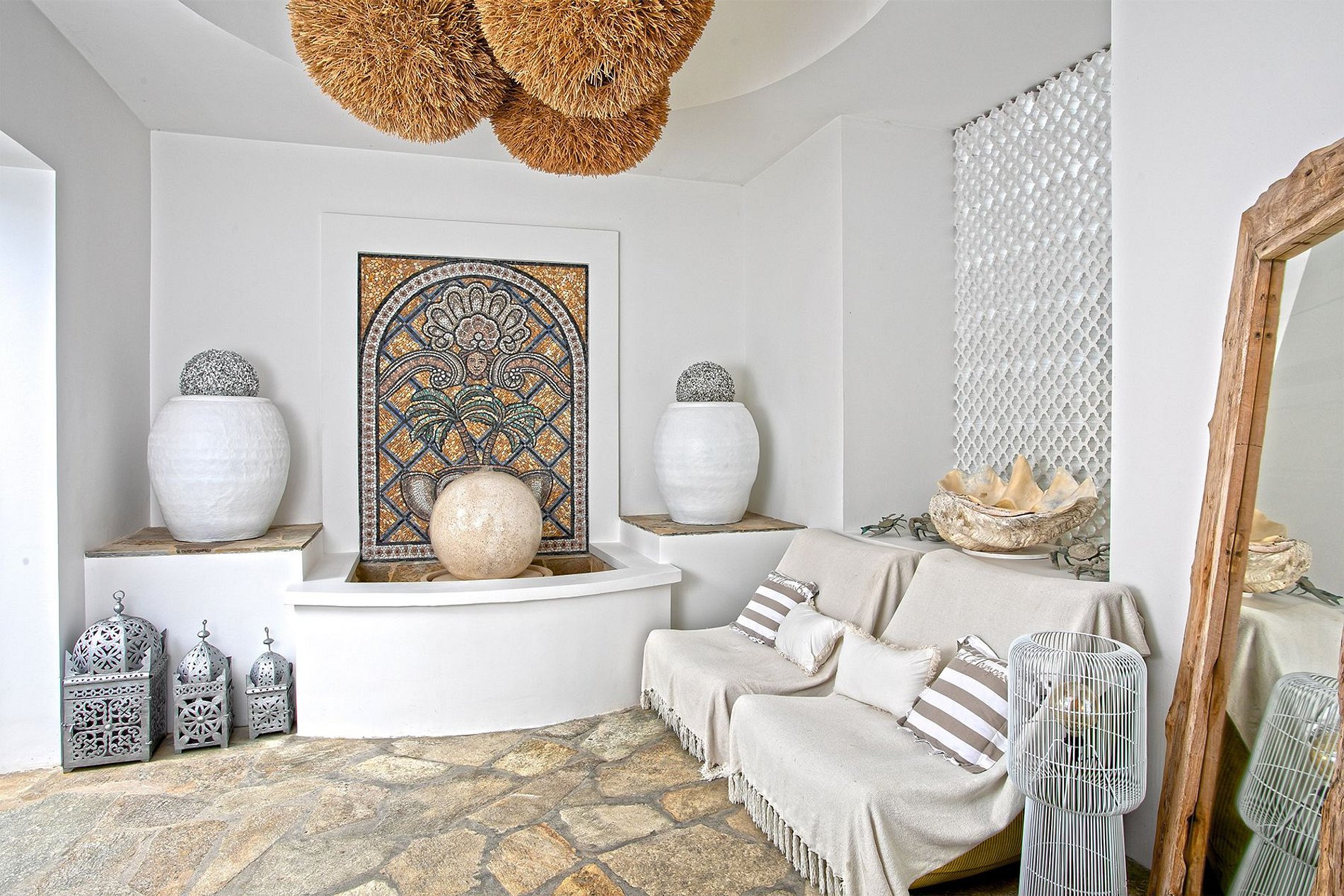 A domed foyer opens to a large living room with soaring ceilings, natural stone floors, and sweeping ocean views. Glass doors lead to a covered terrace with a dining area for 12 guests, which overlooks a spacious sun deck, an asymmetrical pool, and a gazebo perched above the sea. A second pool and lounging area sit at beach level, just steps from the sand.