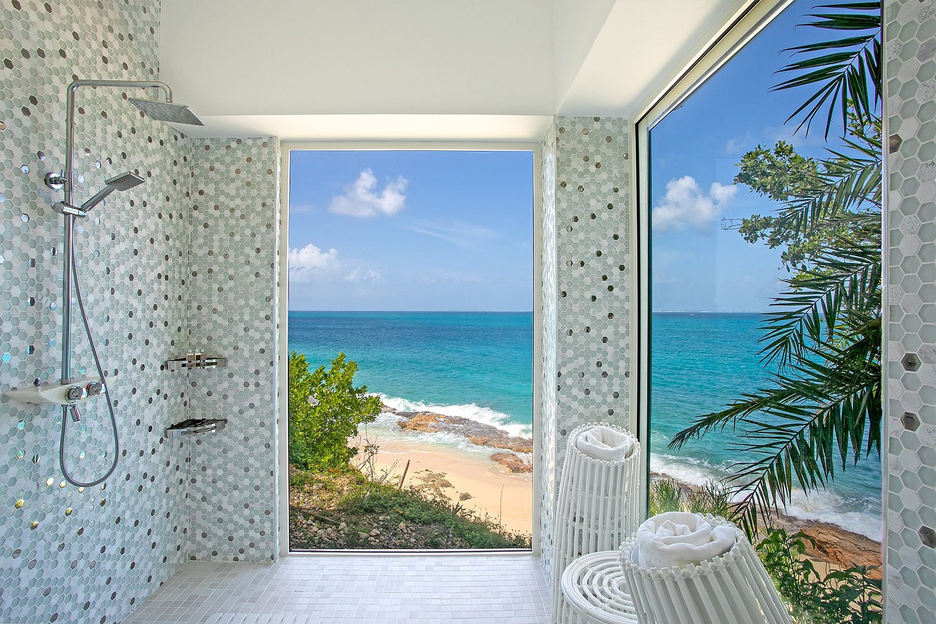 Additional amenities include a media room with surround sound, a spa with massage and steam room, a fitness room with ocean views, and a second kitchen to support outdoor service. The villa is fully staffed with a chef and housekeeping team.