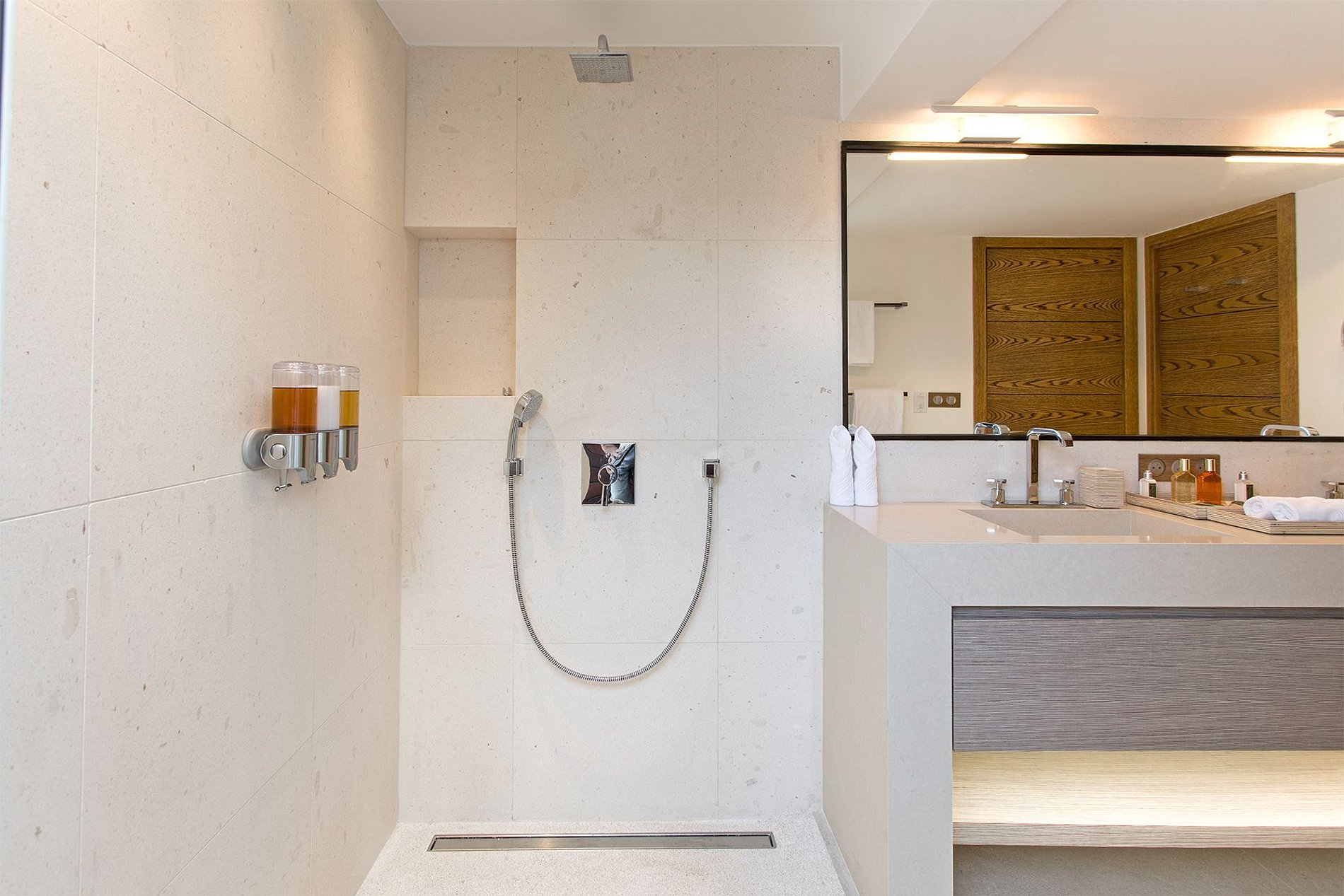 All five bedrooms feature king-size beds, en-suite bathrooms with rain showers, double vanities, and private garden showers. Four bedrooms include walk-in closets, and the master suite adds a lounge area and a private terrace with a jacuzzi. All rooms include smart TVs and Bose soundbars with Bluetooth connection.