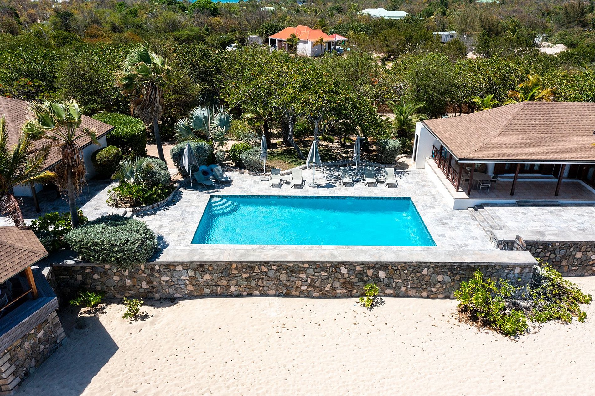 Though secluded, the villa is close to restaurants, shops, and markets in Baie Nettle, Porto Cupecoy, and Marigot. It’s only 8 minutes to the airport and about 30 minutes to both Grand Case and Philipsburg. For larger groups, the villa may be rented along with its neighbor for expanded capacity, offering a rare private beachfront setting.