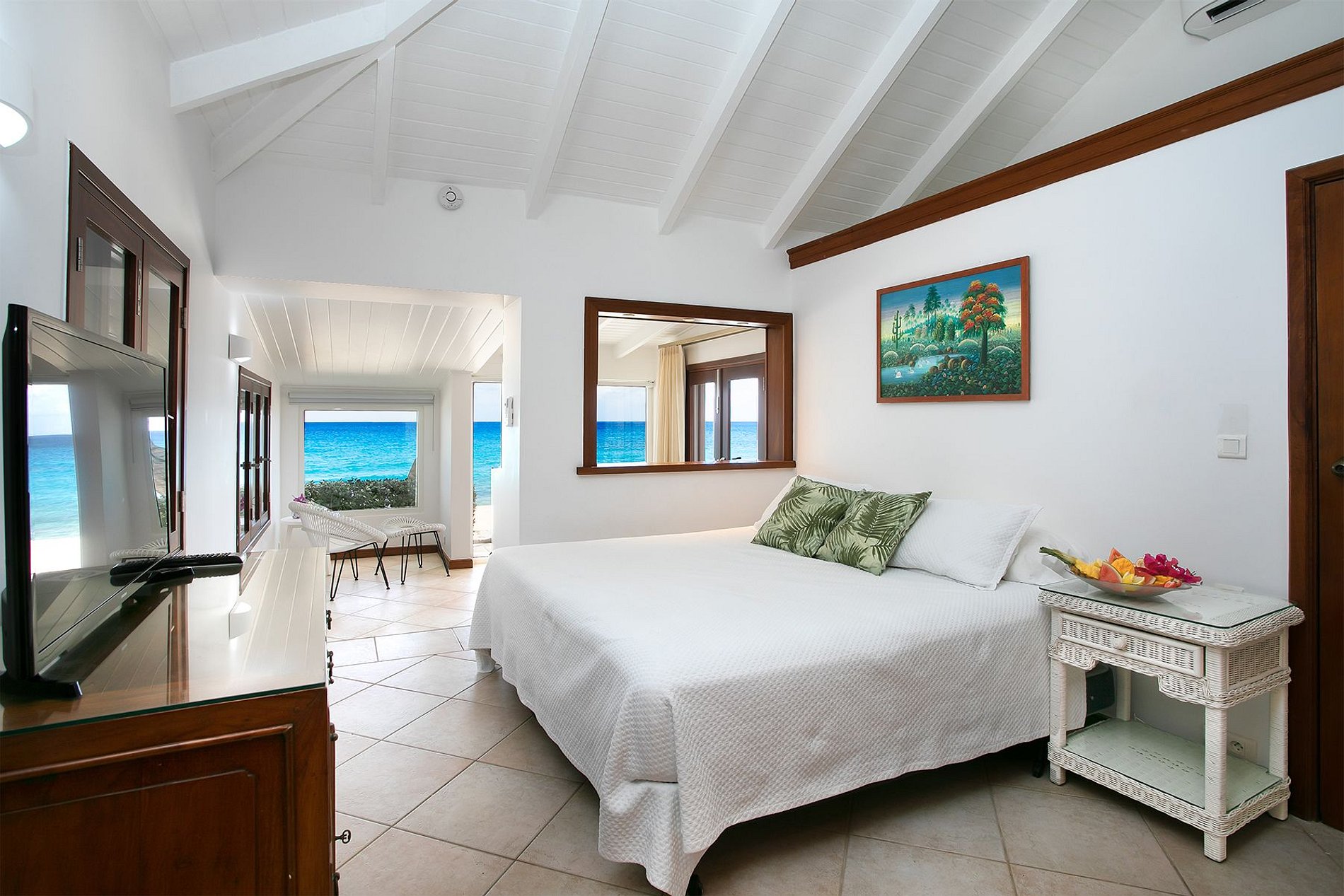 All four bedrooms include sea views, en-suite bathrooms, air conditioning, and natural materials like mahogany, wicker, and white linens. The design blends Old Caribbean charm with comfort and simplicity. A small gazebo and coral stone sea wall mark the transition between the private grounds and the beach.