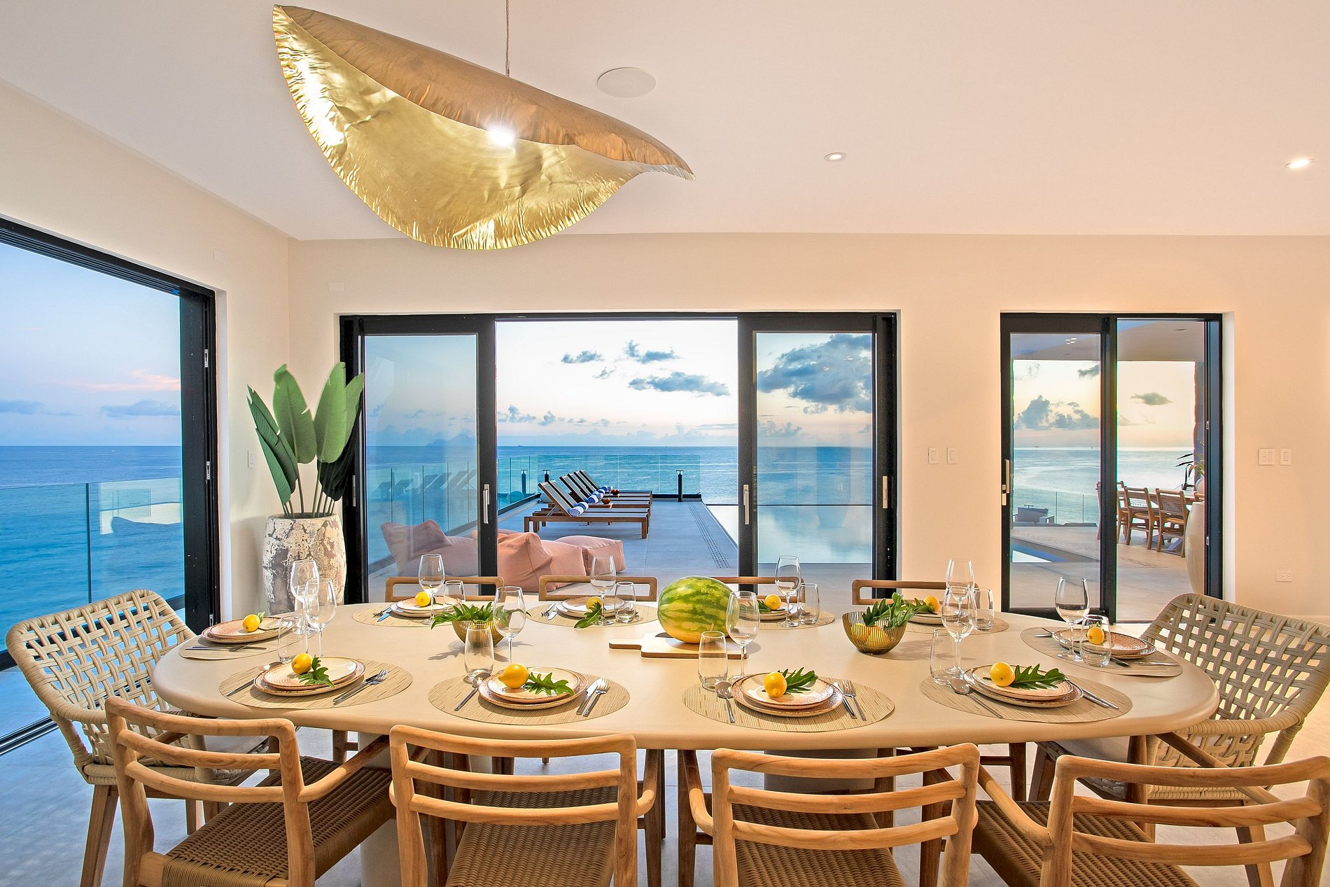 The home features sleek lines, neutral tones, and minimalist interior styling that enhance the feeling of calm sophistication. The main level includes a spacious living room, a state-of-the-art kitchen with breakfast bar, and a dining area ideal for entertaining. The outdoor terrace invites guests to relax in the sun or dine al fresco beside the infinity pool, enjoying spectacular sunsets over the Caribbean.