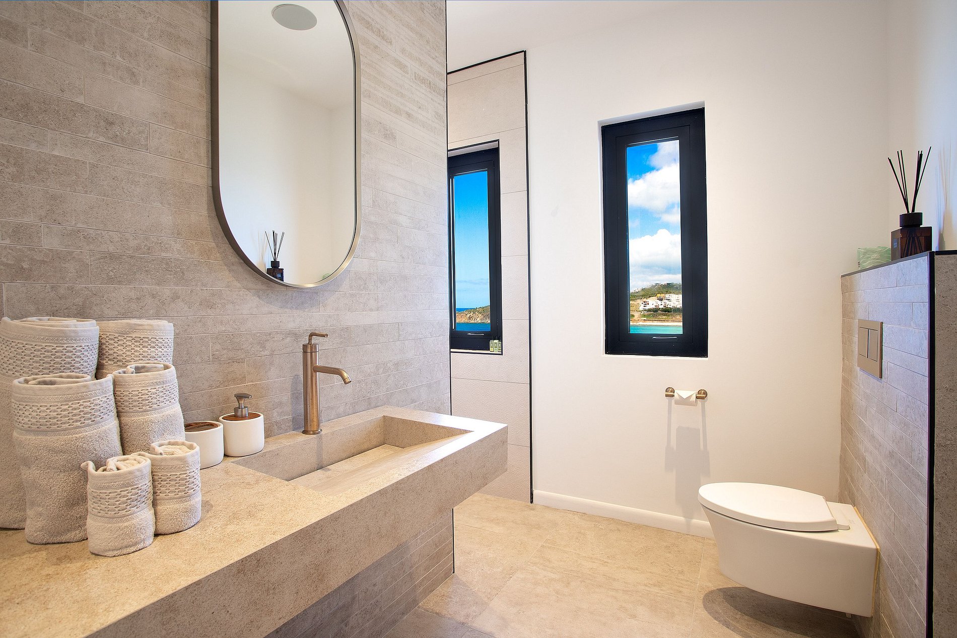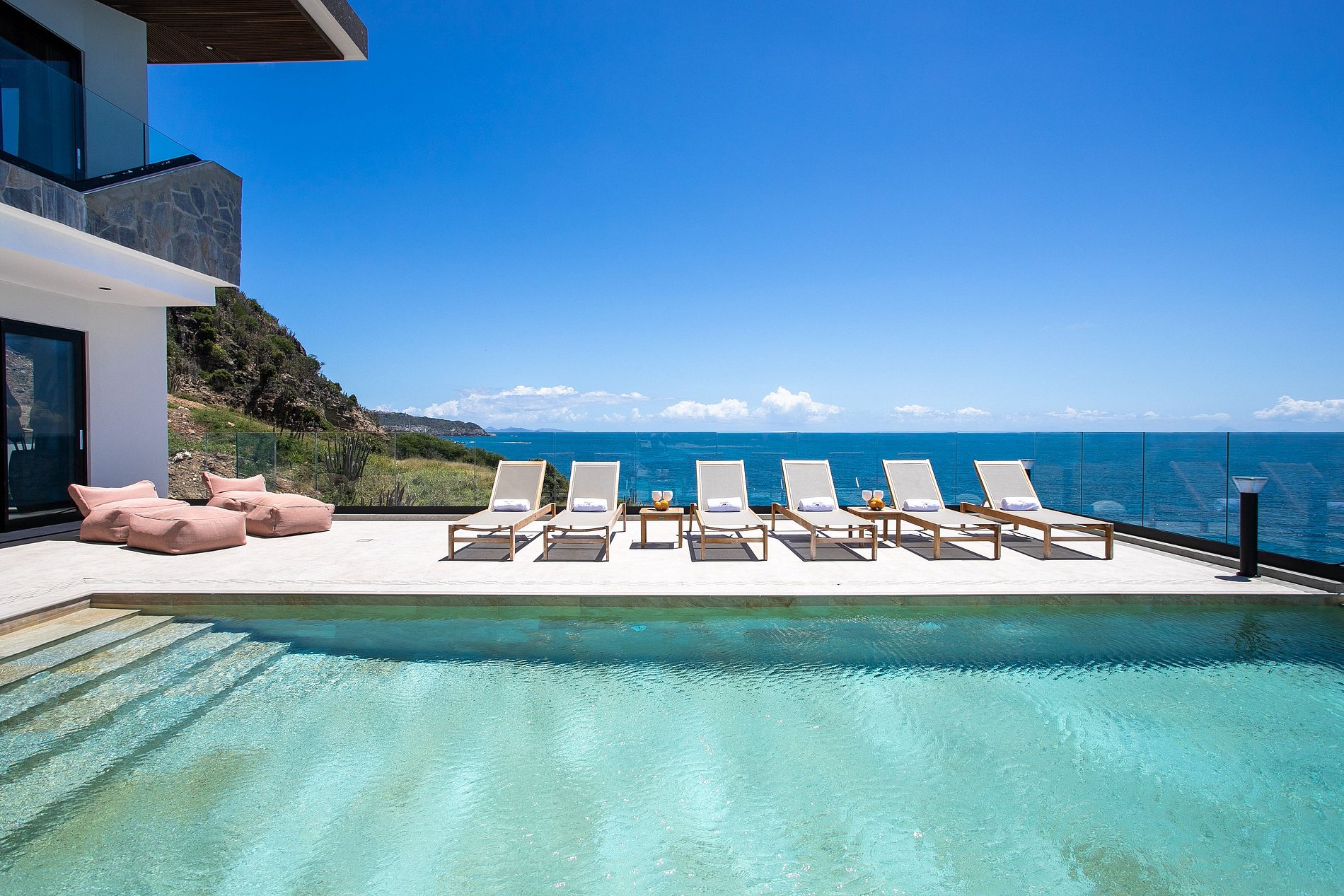 Each of the six bedrooms is designed for privacy and comfort, featuring king-size beds, en-suite bathrooms, and direct access to the terrace or balconies. The master suite offers sweeping ocean views and a luxurious bathroom with walk-in shower. The layout is ideal for large groups, family reunions, or friends traveling together.
