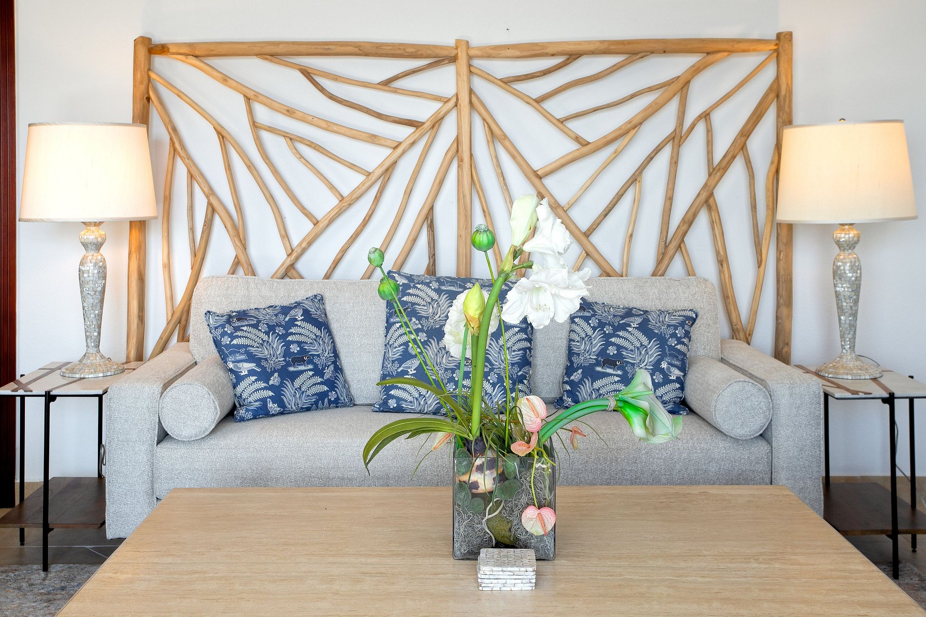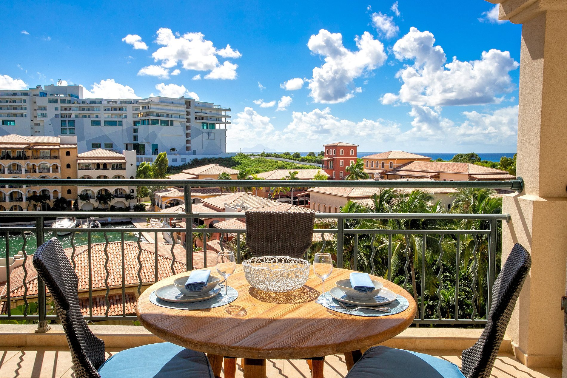 Step out to the large balcony where you’ll find outdoor seating and a dining space overlooking the gardens, the marina, and the blue waters of the lagoon. It’s the perfect setting to enjoy a quiet breakfast or a sunset cocktail.