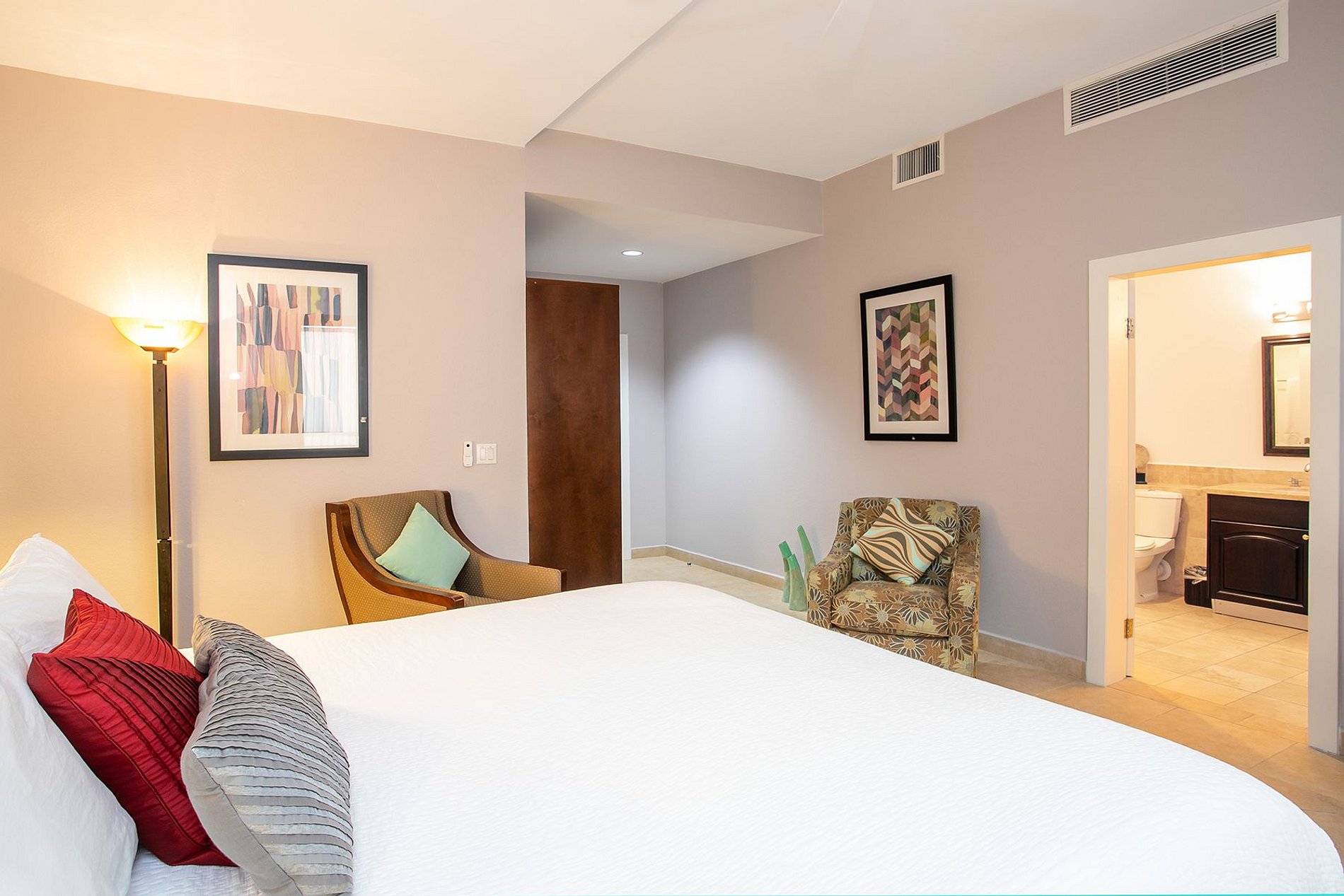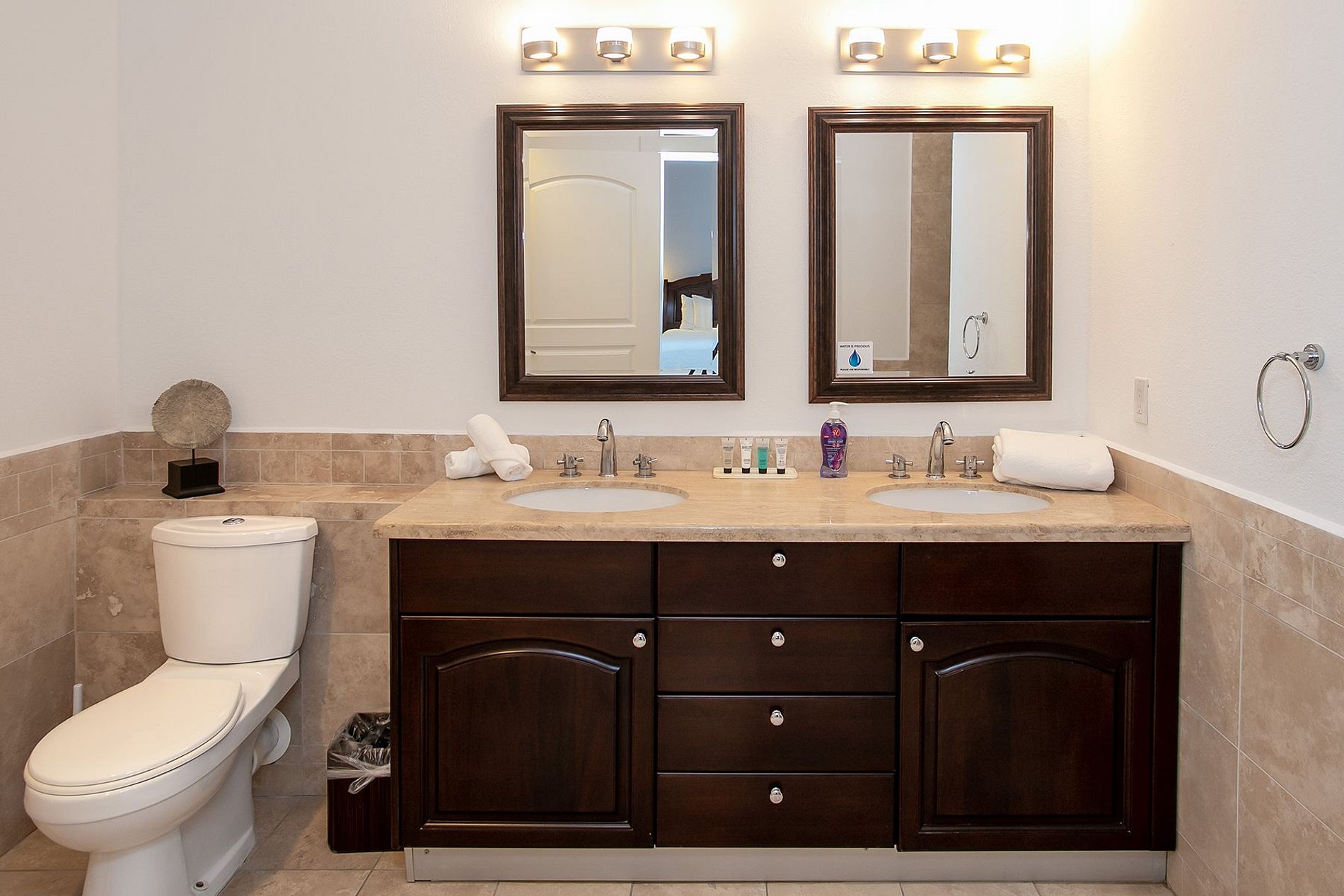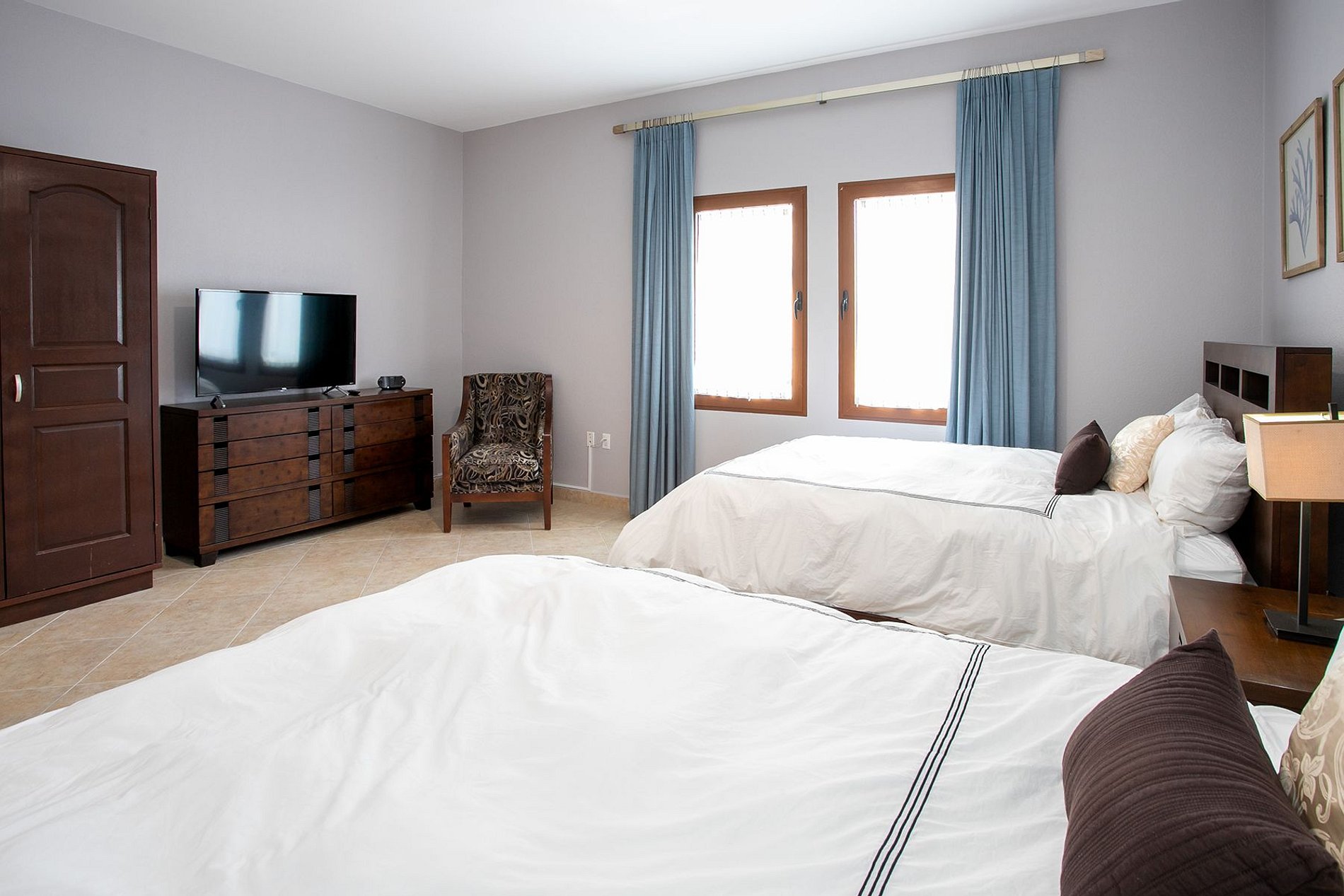 The apartment features three spacious bedrooms, each with its own en-suite bathroom, air conditioning, and Smart TV. The primary bedroom also includes a private balcony and a bathtub with lagoon views. The third bedroom has two queen beds, ideal for families or groups. A guest half-bathroom adds convenience.