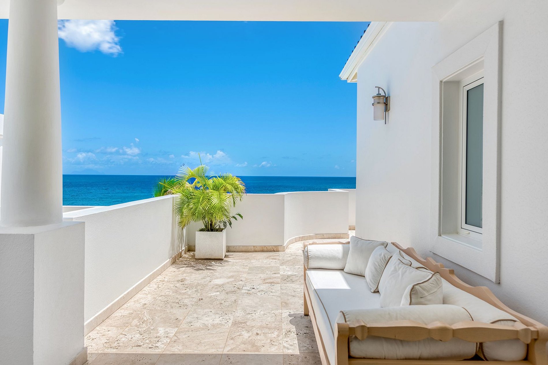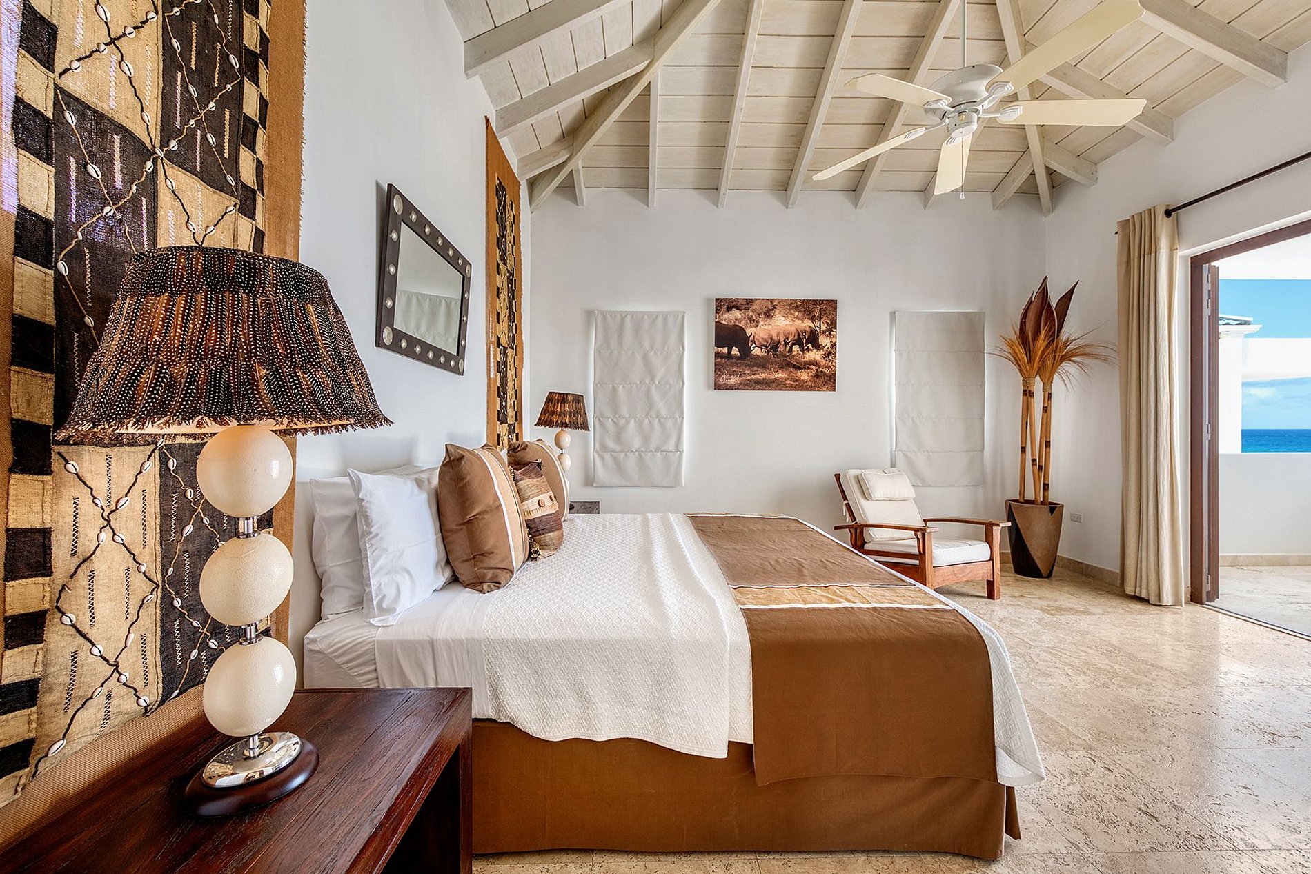 Each of the three king-size bedrooms enjoys sea views, a private seating area, and a spa-style bathroom with walk-in showers. Two suites are upstairs, separated by a hallway for privacy, while the third is on the main floor with direct access to the pool terrace. All bedrooms include custom walk-in closets, TVs, and curated textiles and artwork.