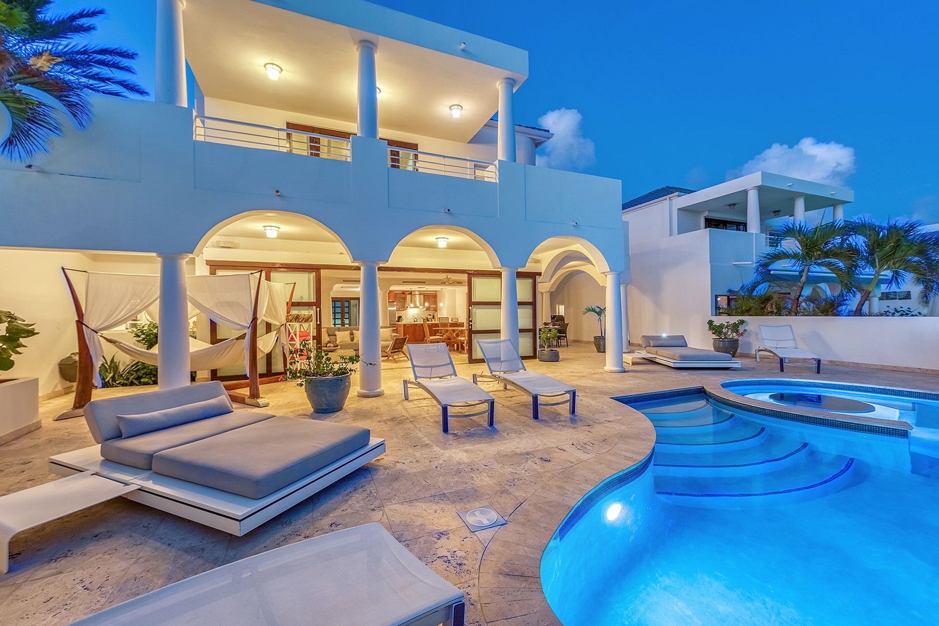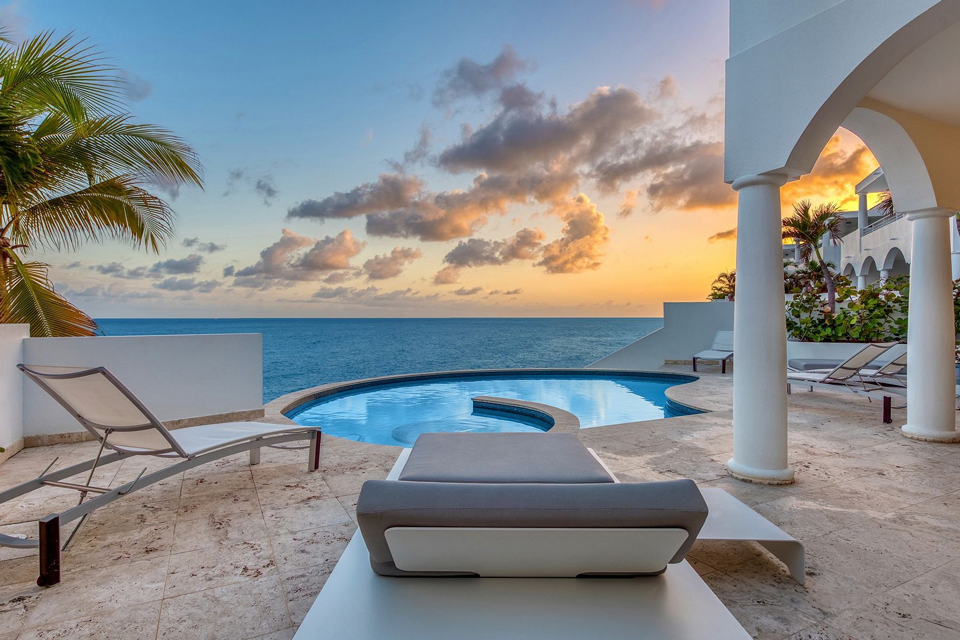 With its exotic garden and contemporary interiors framed by curated art, this elegant beachfront villa offers privacy, comfort, and direct access to the sand. Located in an exclusive gated community on the French-Dutch border, it blends modern Caribbean living with eclectic design and panoramic sea views.