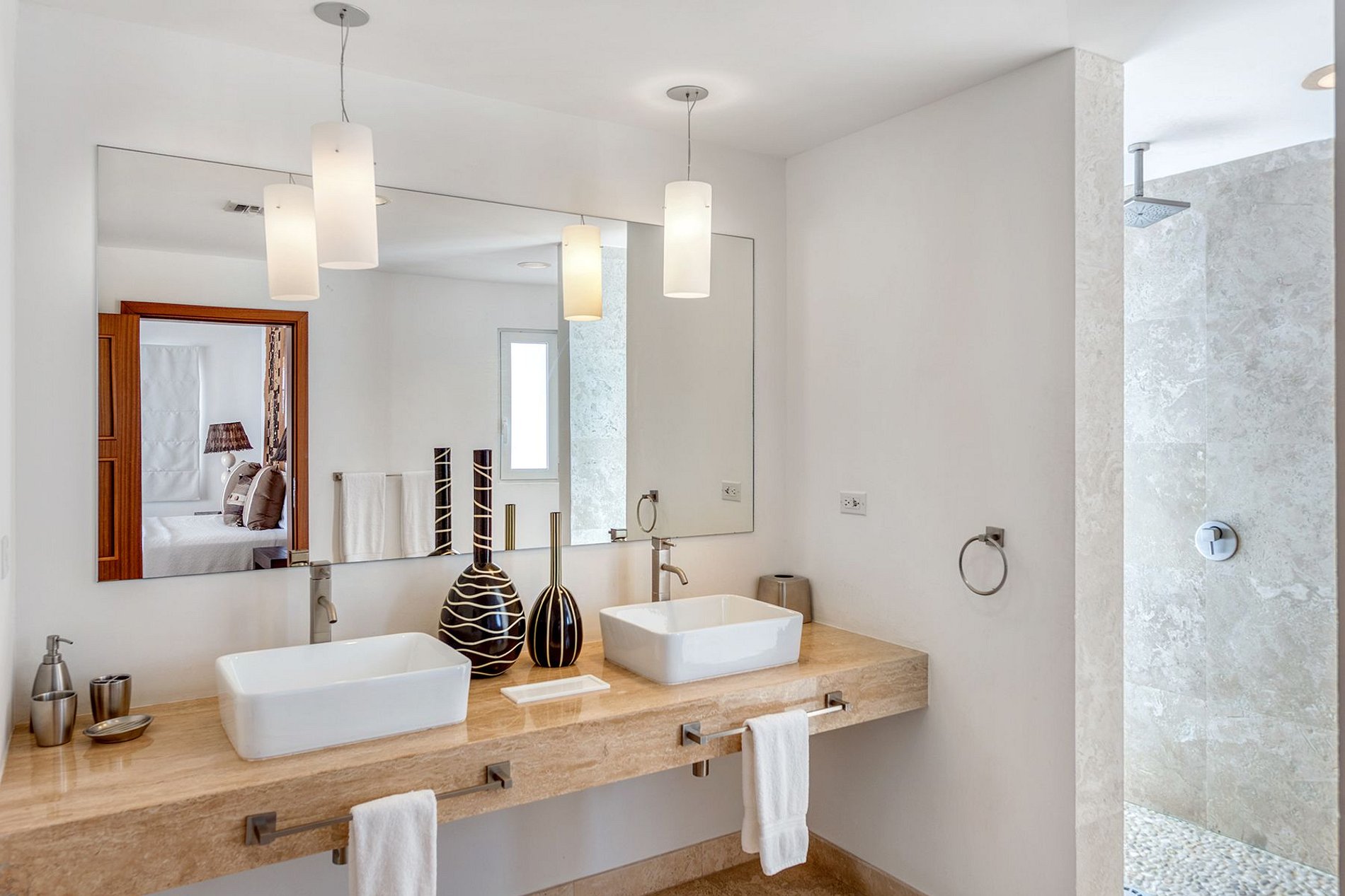 Each of the three king-size bedrooms enjoys sea views, a private seating area, and a spa-style bathroom with walk-in showers. Two suites are upstairs, separated by a hallway for privacy, while the third is on the main floor with direct access to the pool terrace. All bedrooms include custom walk-in closets, TVs, and curated textiles and artwork.