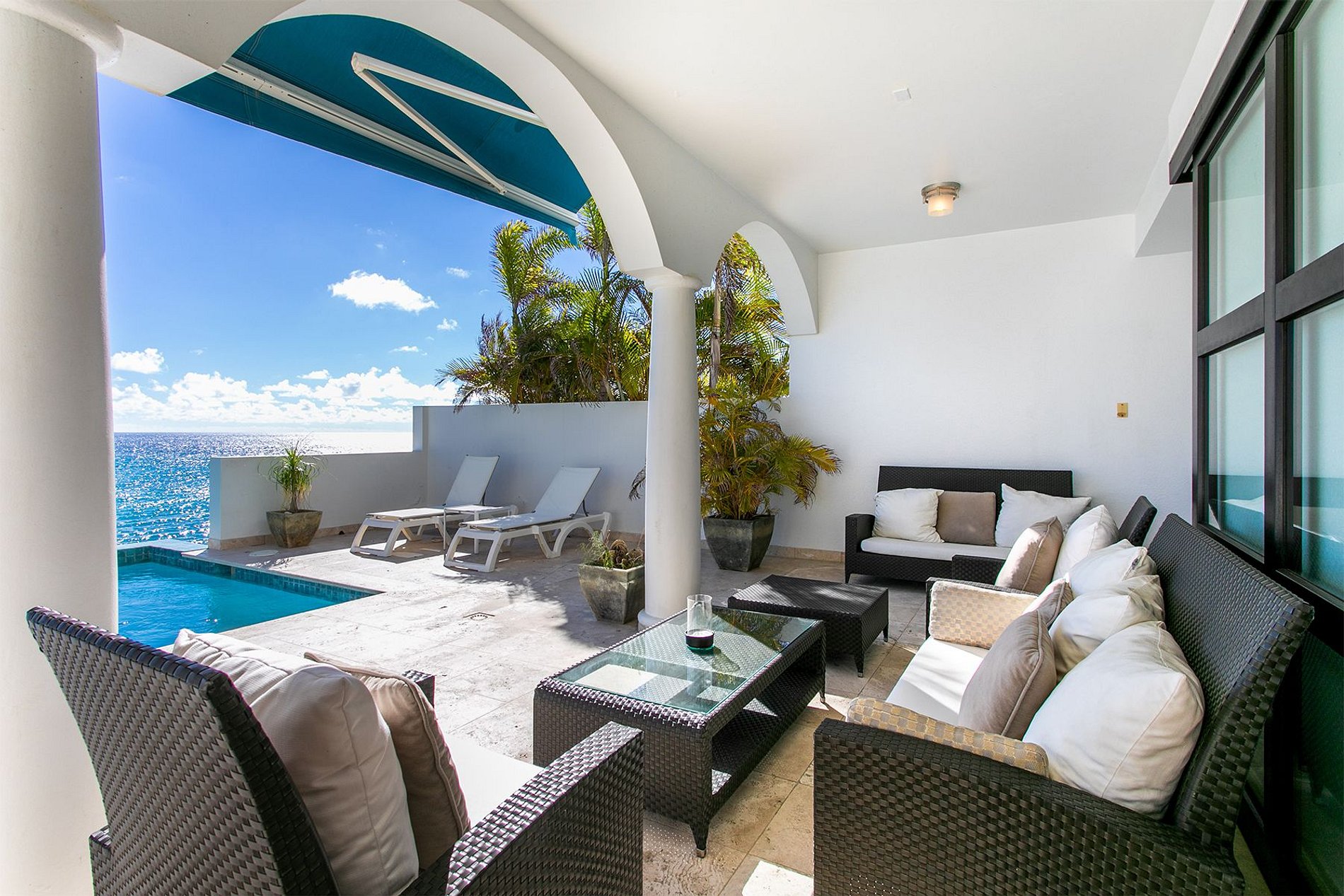 This elegant four-bedroom villa combines privacy, tropical architecture, and unbeatable views over the Caribbean Sea. Located in the exclusive gated community on Cupecoy Beach, it offers direct access to the sand and is just steps from Porto Cupecoy’s marina, gourmet market, and restaurants.