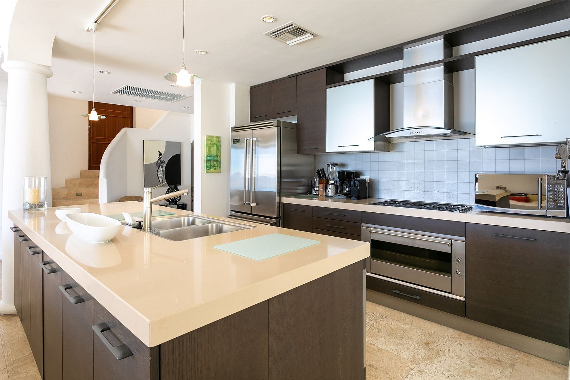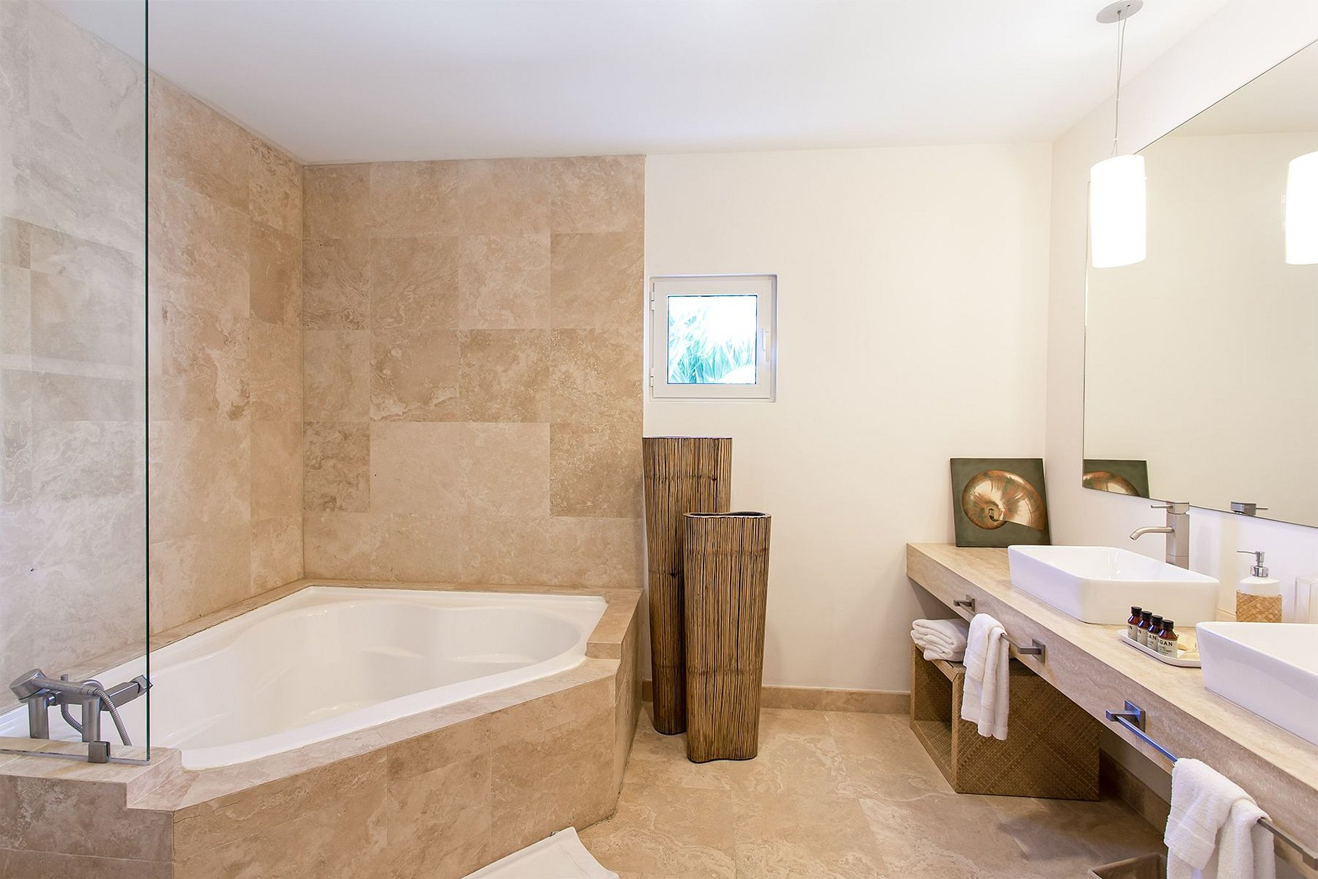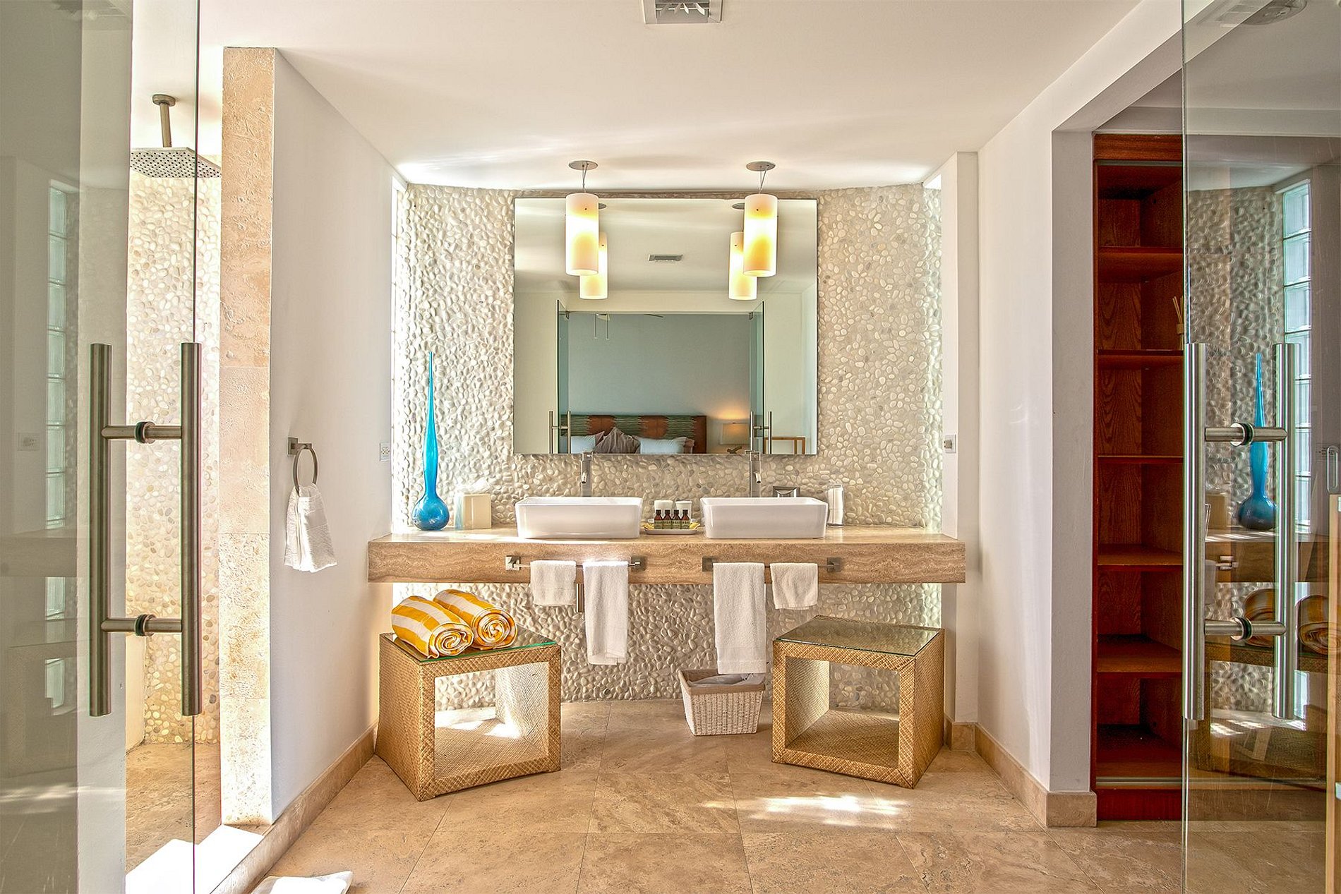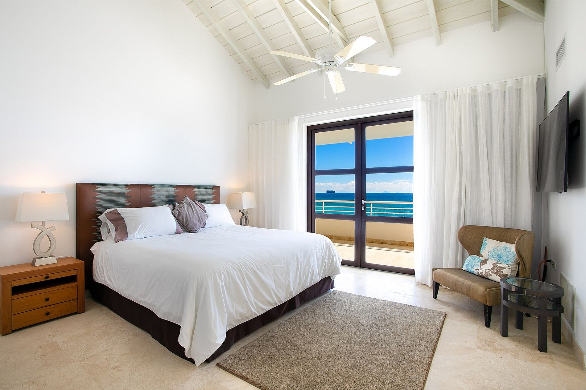 One bedroom is on the main level, while three additional suites, including the master, are on the upper floor. All have king-size beds, en-suite bathrooms, and access to outdoor terraces. Interiors are decorated with modern Caribbean style, clean lines, and light tones, creating a relaxed and inviting atmosphere.