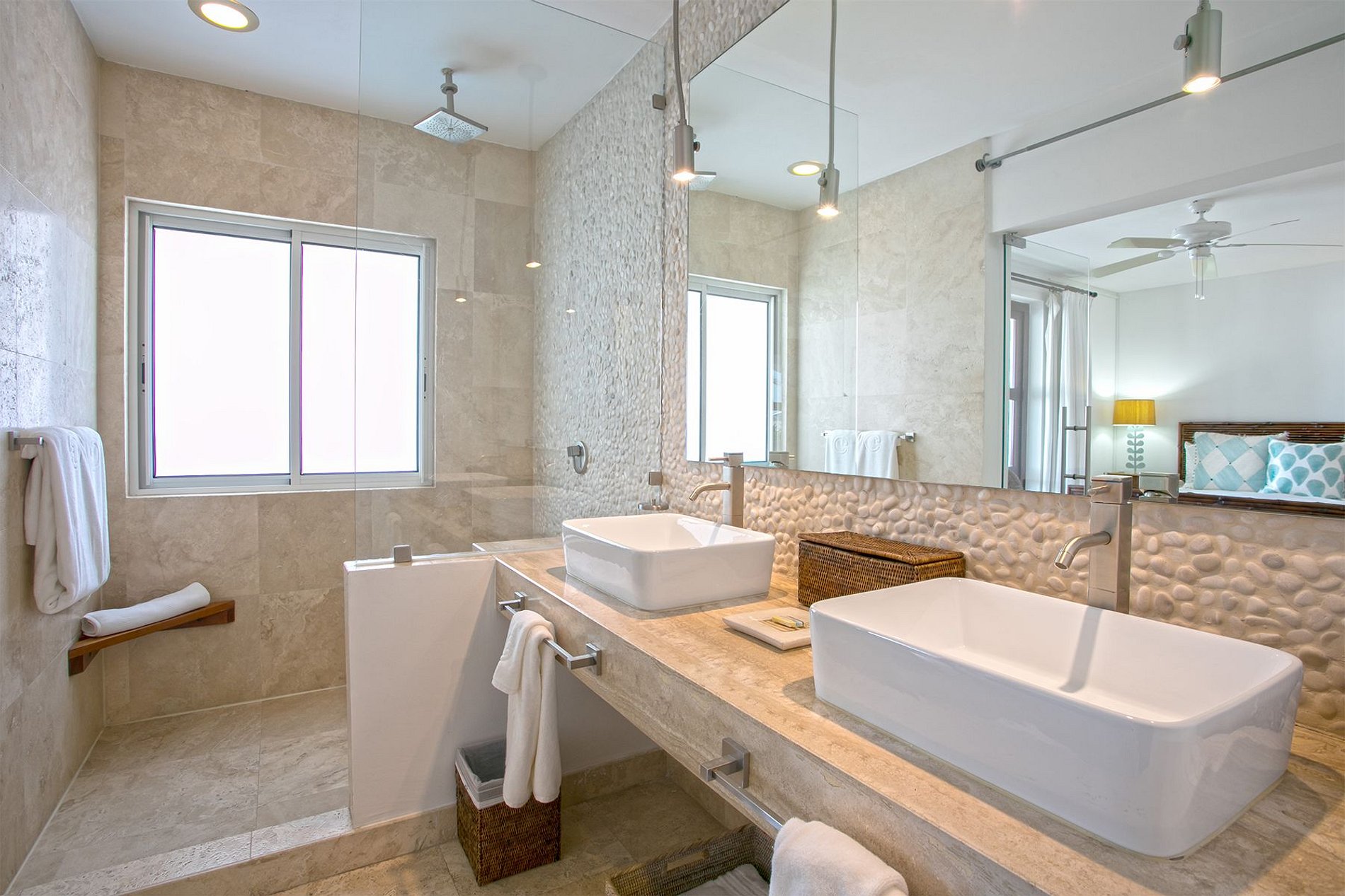 Two king bedrooms are located on the first level, each with ocean-facing balconies and en-suite bathrooms with pebble floors, open showers, and double vanities. The third bedroom sits on the top floor next to the plunge pool and sun deck, with a private balcony and a large bathroom offering stunning sea views.