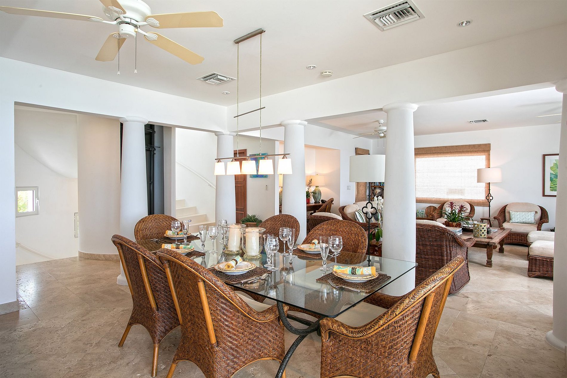 The second floor houses a spacious living and dining area with rattan and tropical wood furnishings, travertine floors, and elegant columns separating the lounge from the eight-person dining table. Large glass doors open to a furnished balcony facing the turquoise water. The kitchen features a central island, ample counter space, and stainless steel appliances.