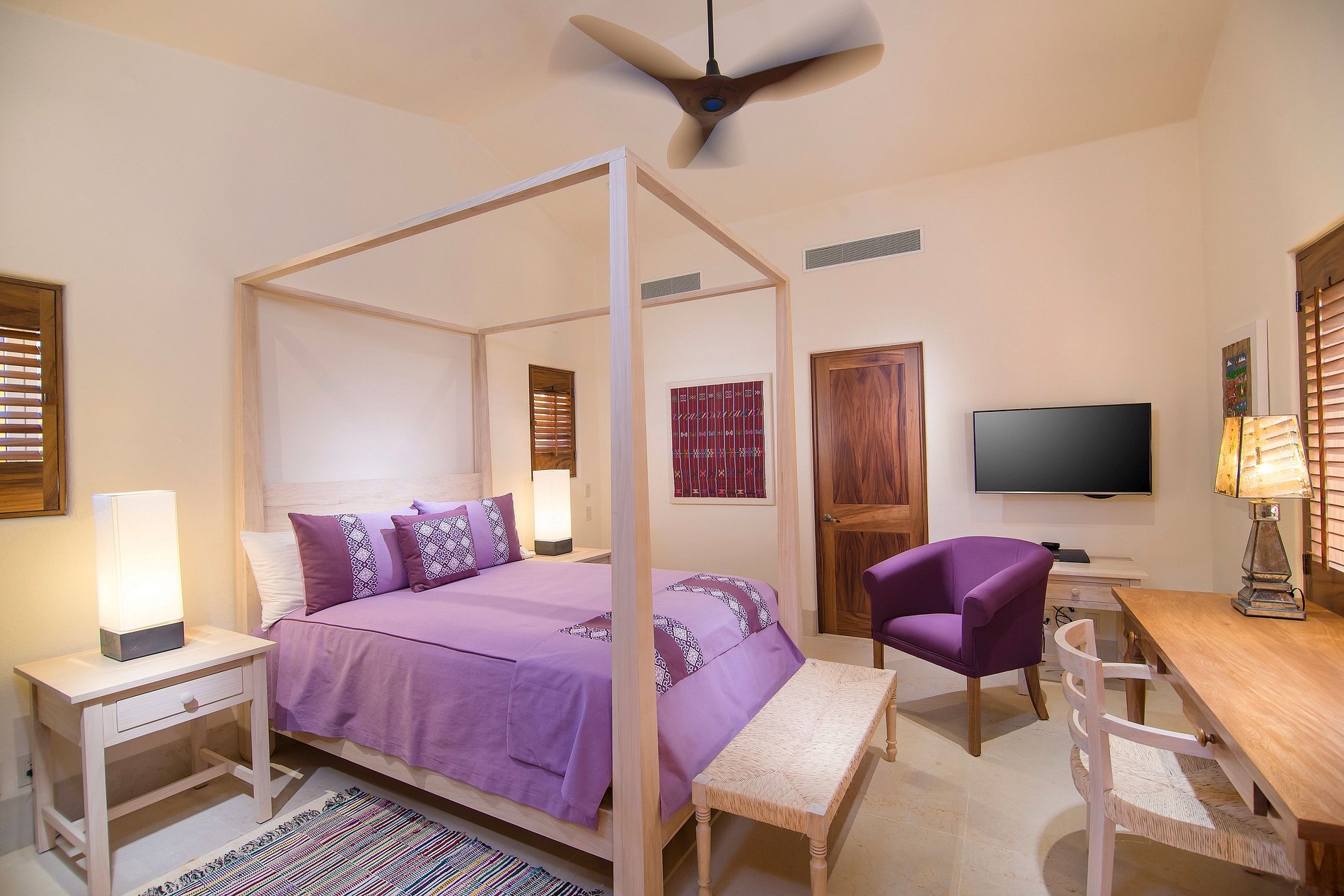 Bedroom 2: king size bed, ensuite bathroom, television, ceiling fan, private balcony, outdoor furniture