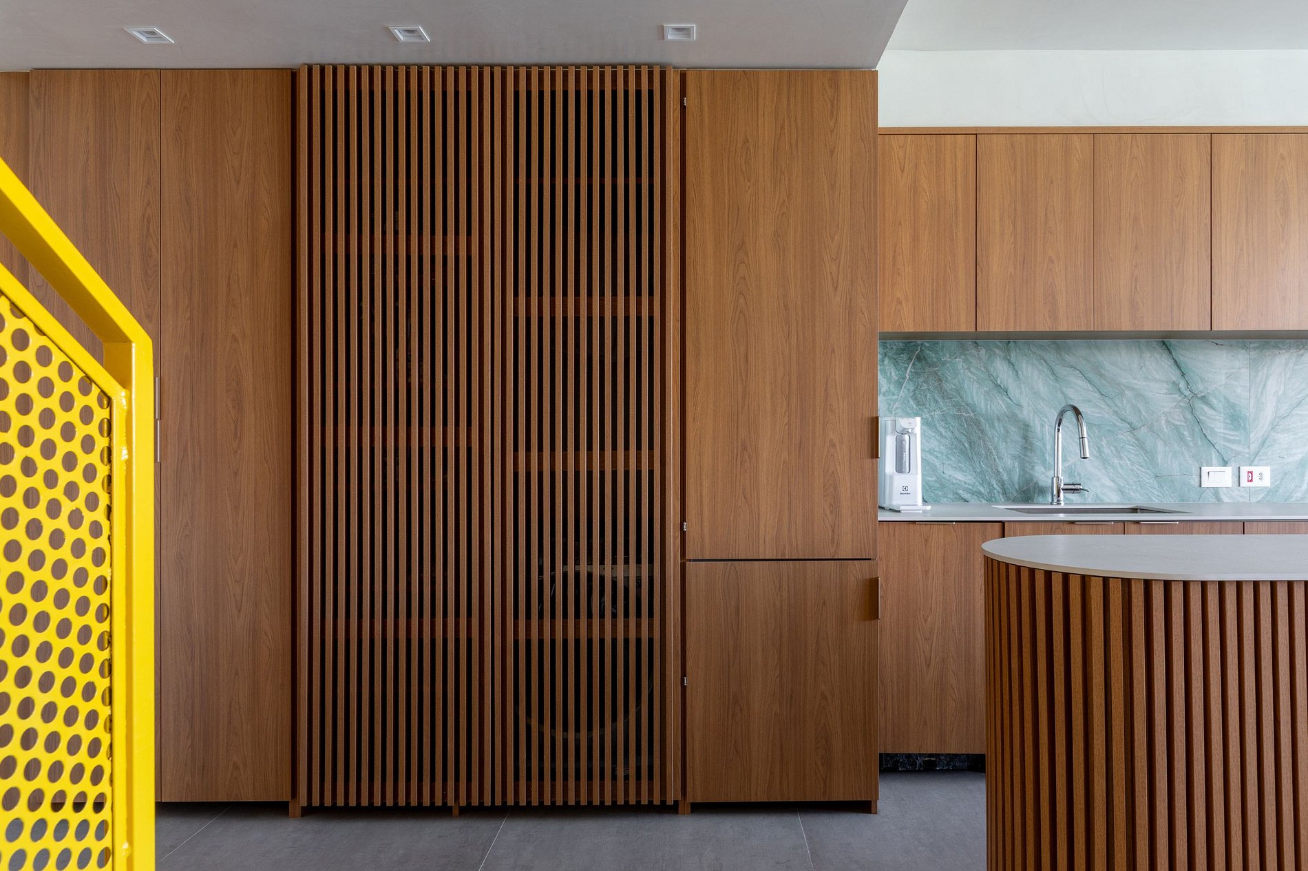 The penthouse has two spacious suites with elegant decor and breathtaking views. One suite features an artistic tile wall, while the other combines harmoniously warm woods with soft colors, creating an inviting and relaxing atmosphere.