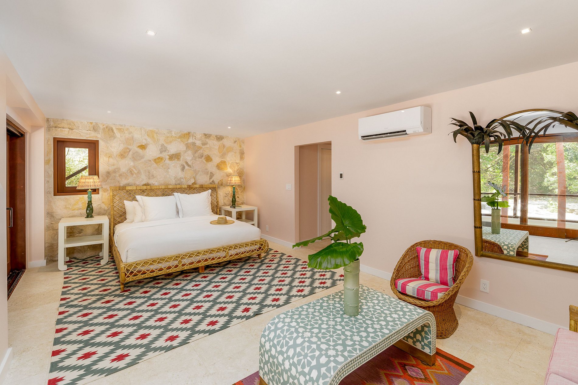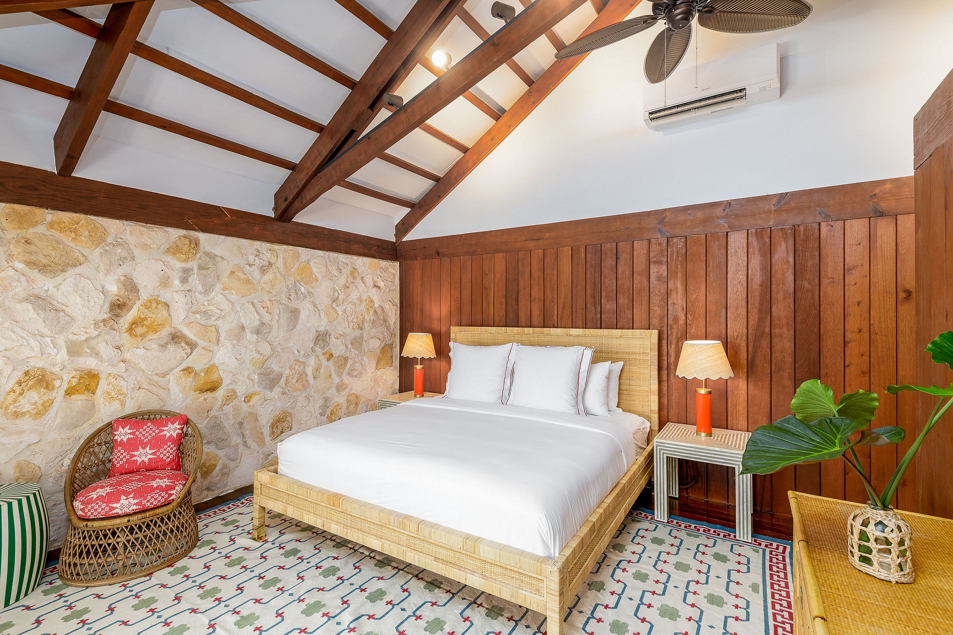 The main house includes four ocean-view king bedrooms, while the guest house features a queen bed and two bunk beds—ideal for families. Designed with wraparound verandas, canopy-level breezes, and indoor-outdoor living spaces, the villa blends comfort and style. Enjoy alfresco dining, a heated pool, rooftop deck, and direct beach access. A full staff including butler and housekeeping ensures a relaxed, unforgettable stay.