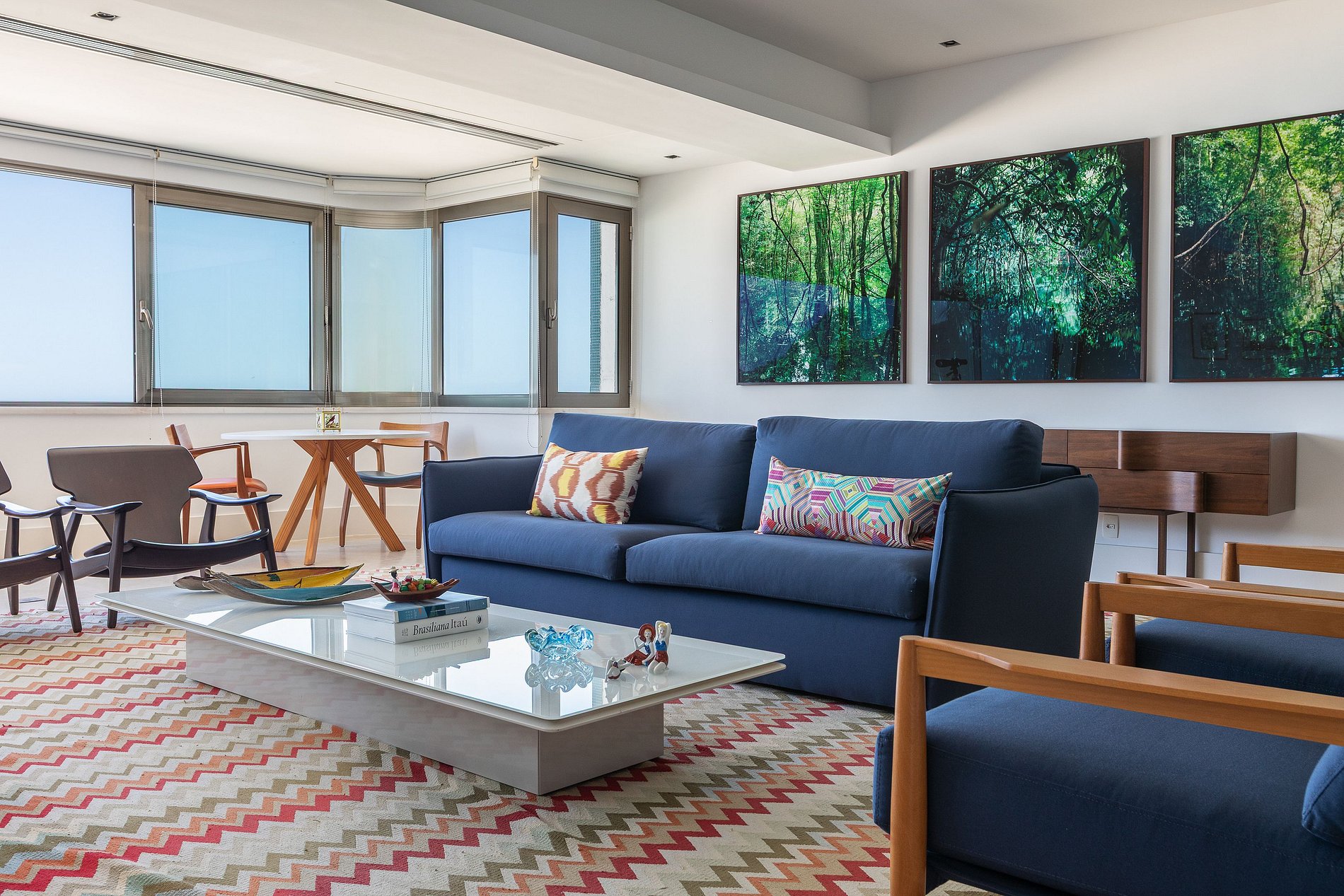 At the heart of the apartment, a spacious living room flooded with natural light opens onto floor-to-ceiling windows that reveal a breathtaking panorama of Copacabana Bay — from the historic fort on the right to the lush green mountains of Leme.