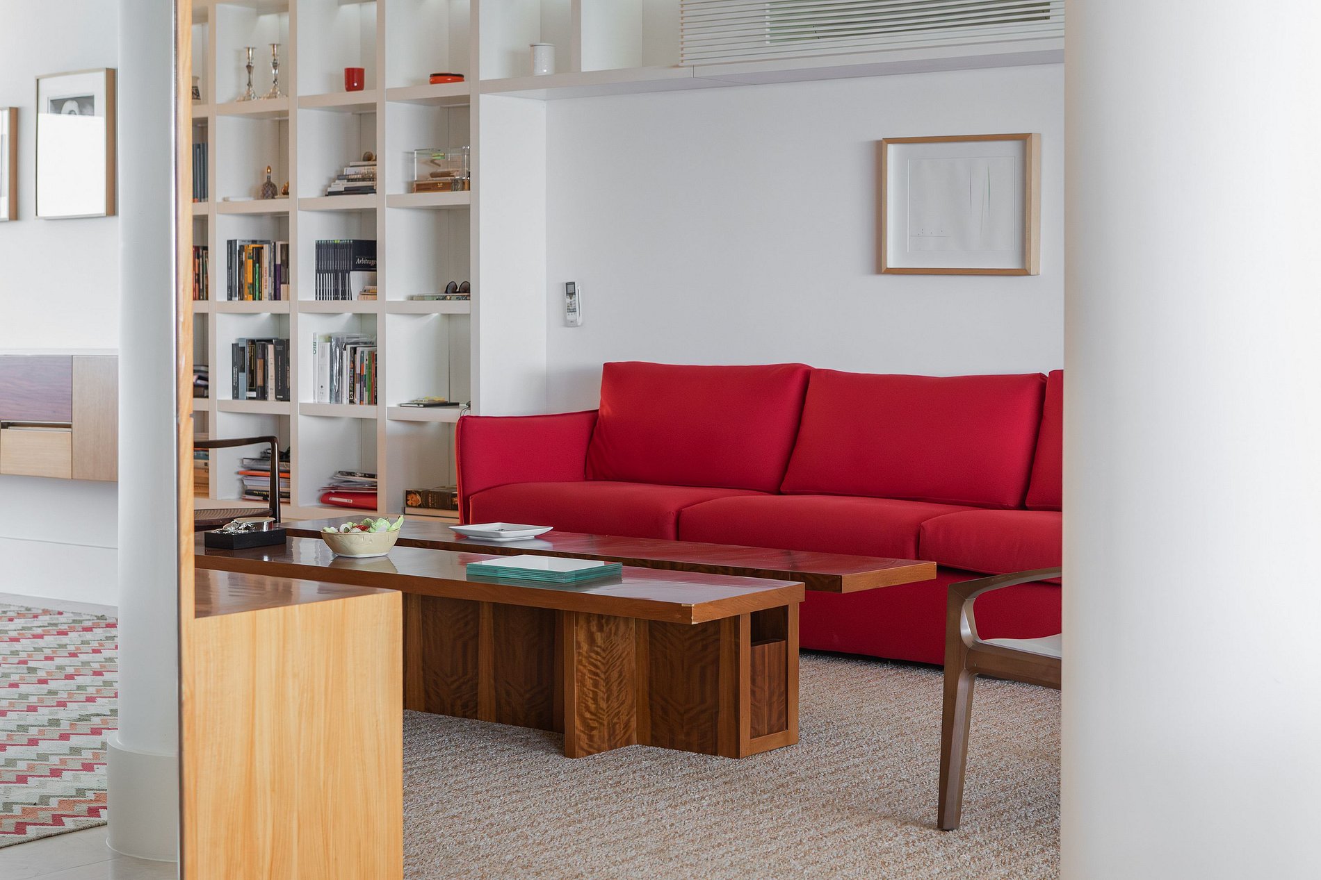 At the heart of the apartment, a spacious living room flooded with natural light opens onto floor-to-ceiling windows that reveal a breathtaking panorama of Copacabana Bay — from the historic fort on the right to the lush green mountains of Leme.