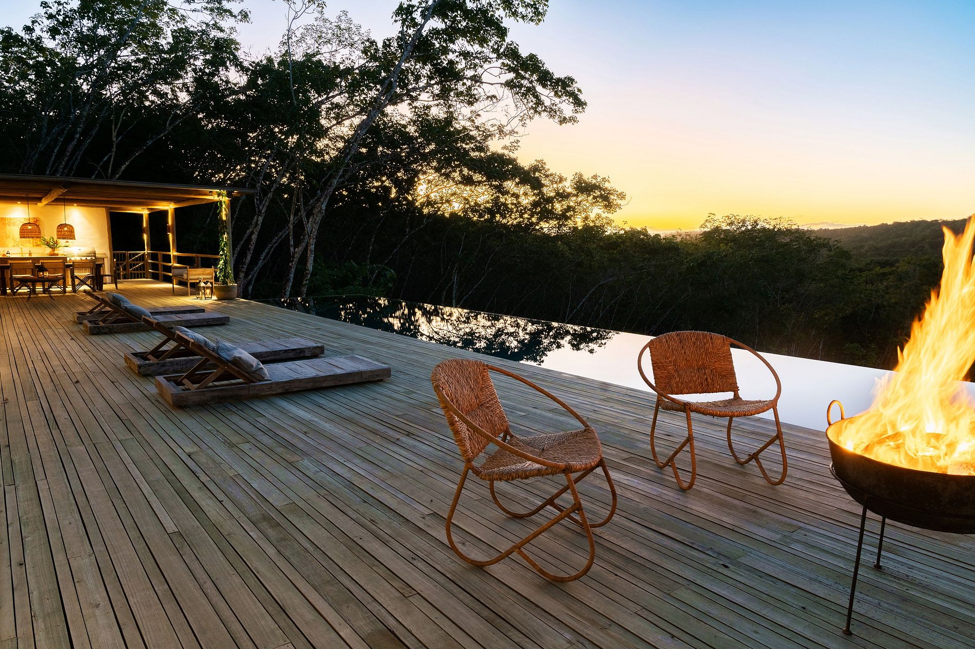Suspended, with infinity edge, ozone treatment and panoramic views of the valley. There are 16m x 3.5m of crystalline water reflecting sunlight that seems to merge perfectly with the landscape. Providing a unique experience of relaxation and contemplation, supported by 4 loungers, a sofa and a pot for a fire.