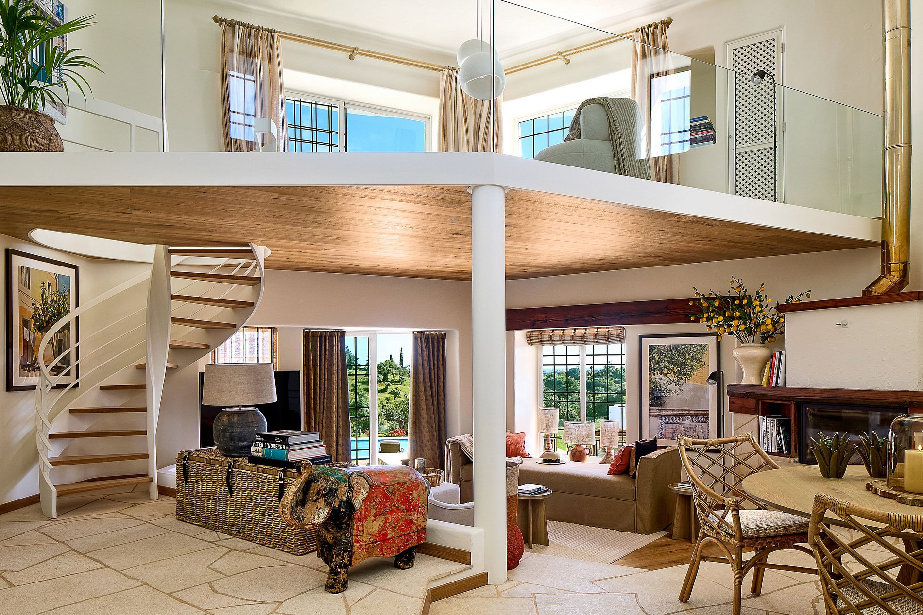 At the heart of the home, the open-concept living and dining area flows seamlessly into a fully equipped kitchen — perfect for long, slow meals and cosy evenings by the fireplace. A charming mezzanine above offers a tranquil reading nook that opens onto a 360º rooftop terrace with sweeping views over the surrounding vineyards and the distant sea.